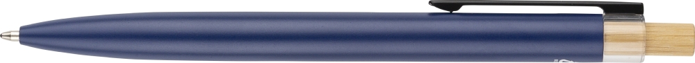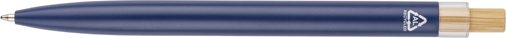 Recycled aluminium lacquered push ballpen with bamboo pusher, rPET trim, and metal clip. Features an engraved recycled logo. Approximate writing length of 700 metres. Blue ink. Dimensions: 1 cm x 14 cm x 1,34 cm