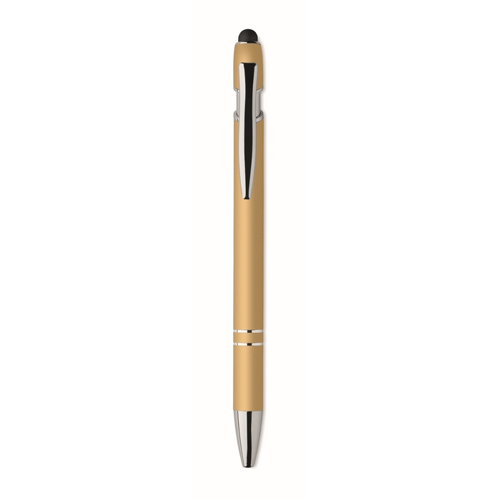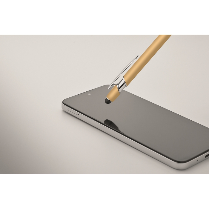 Recycled aluminium stylus push ball pen. Blue ink. Dimensions: 14 x 1 cm