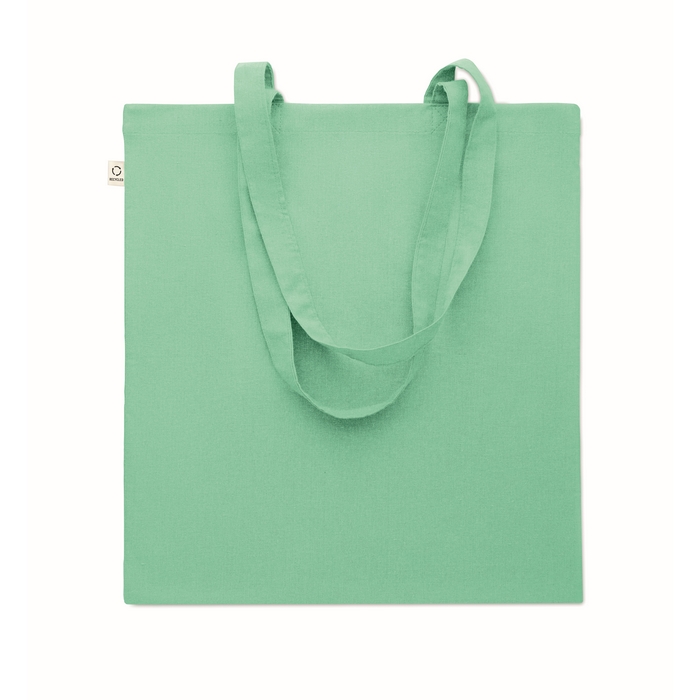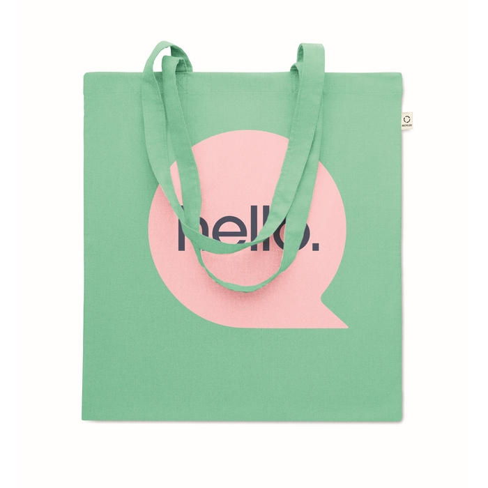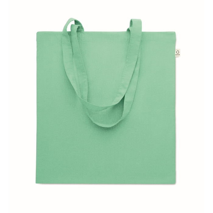 Recycled pre-consumer cotton shopping bag (70% recycled cotton and 30% RPET) with long handles. 140 gr/m2. This item can shrink after printing. Dimensions: 38 x 42 cm