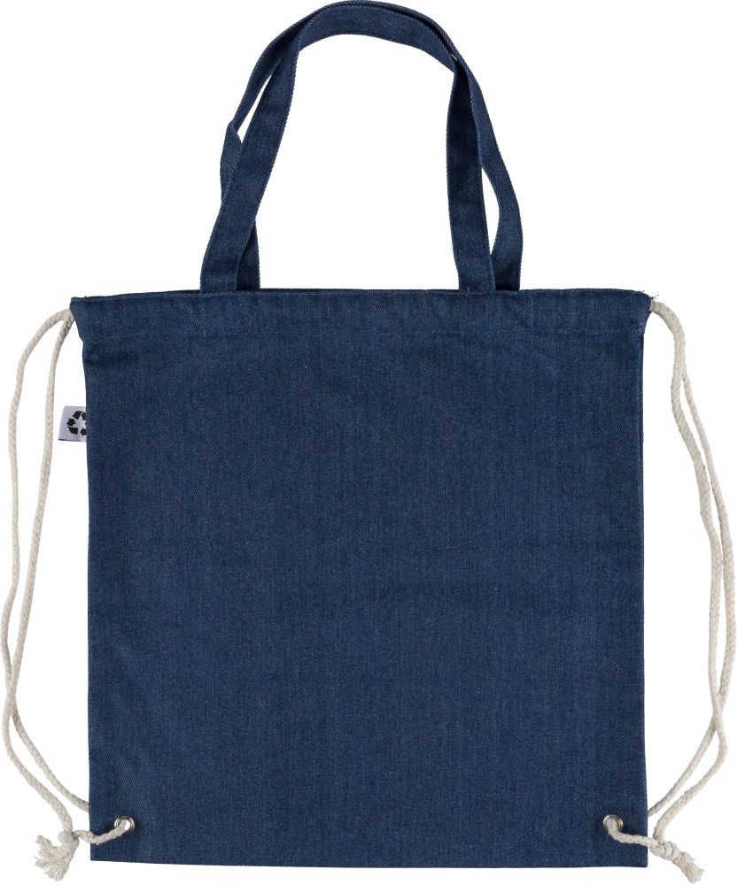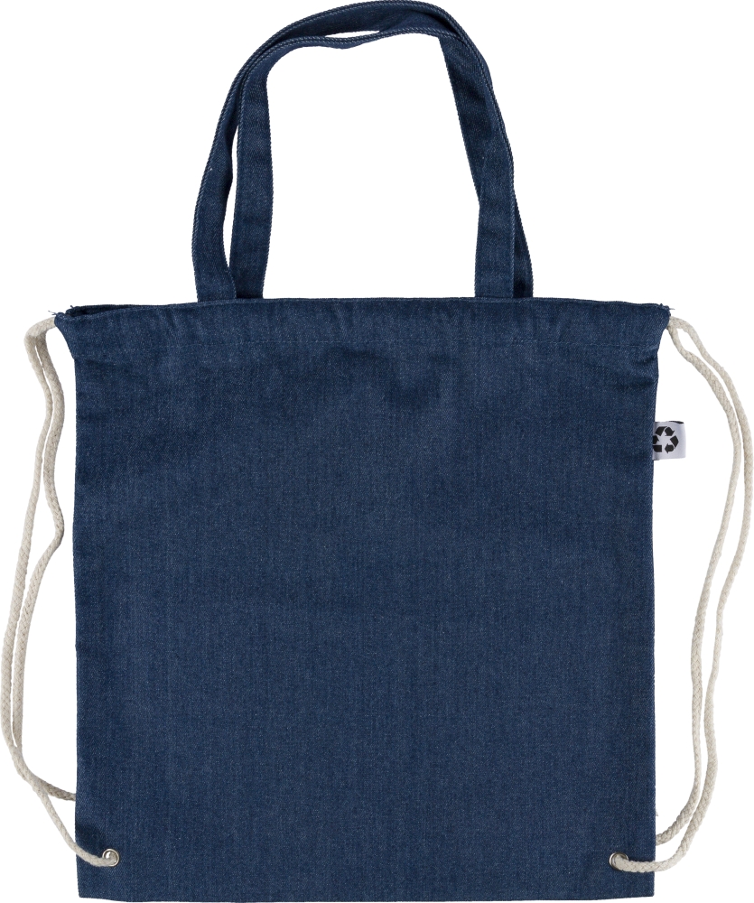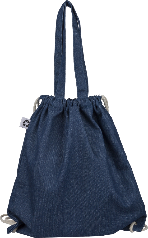 Recycled denim drawstring bag with size 40 x 38 cm. Features long handles of 2.5 x 50 cm and a pull cord for closing. Includes a recycled label on the outside and can be carried by shoulder straps or hand loop. Dimensions: 38 cm x 40 cm