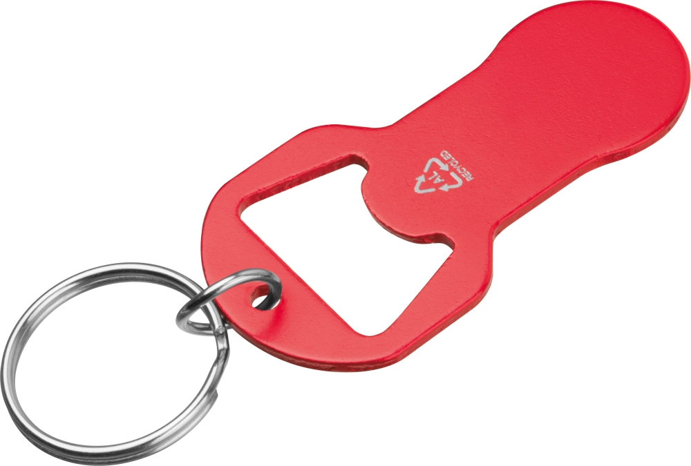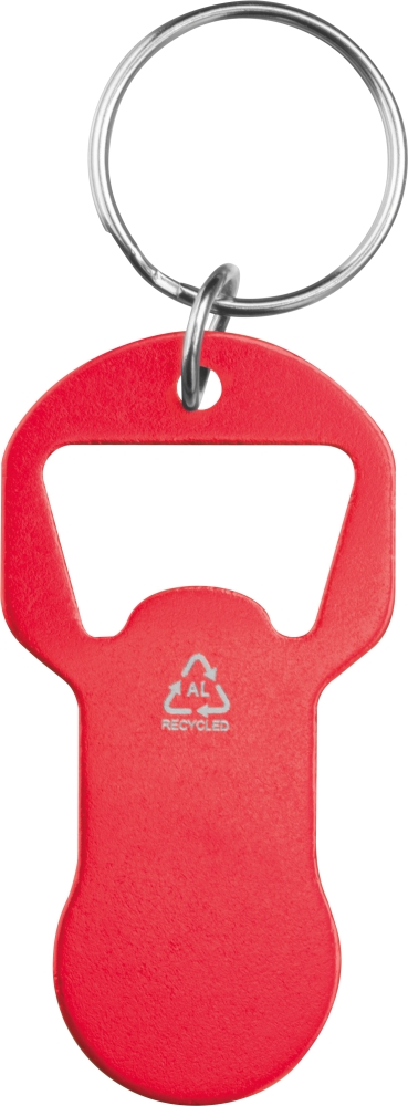 Keychain made of recycled aluminum with integrated bottle opener and shopping cart token. Lightweight, practical, and ideal for everyday use. Dimensions: 6,1 x 3,1 x 0,2 cm