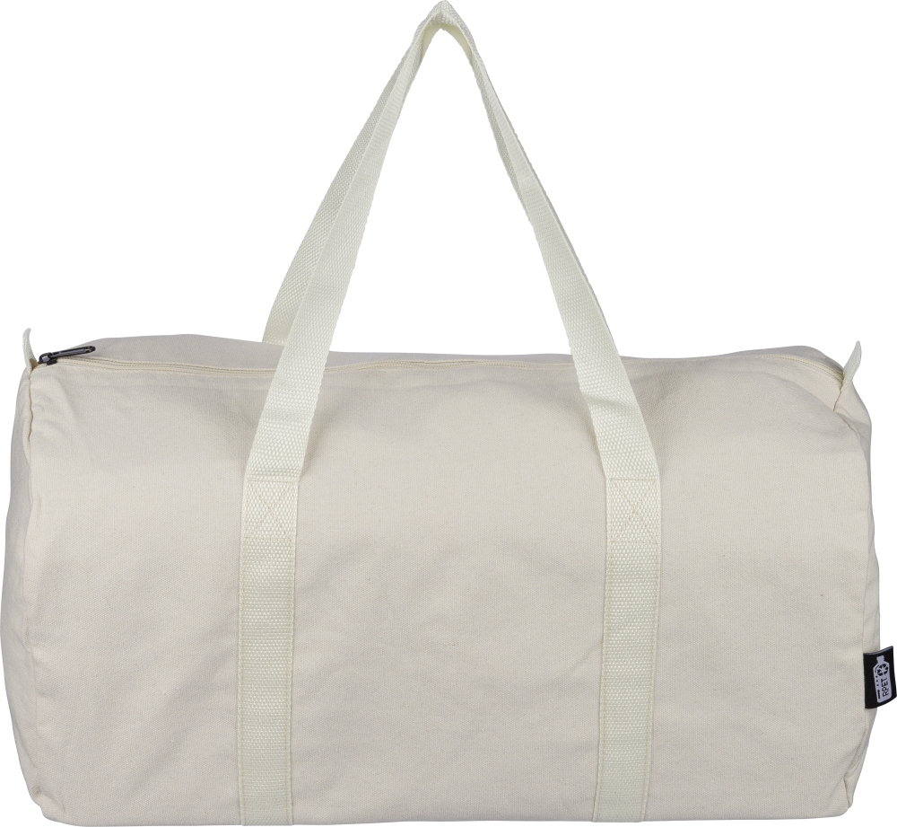 Recycled polycotton (330 gsm) duffle bag with large zippered top compartment. Features long carrying handles (100 cm length, 3 cm width) and matching webbing. Approx. 30 litre capacity. Includes rPET label on the outside and a recycled label inside. Dimensions: 25 cm x 50 cm