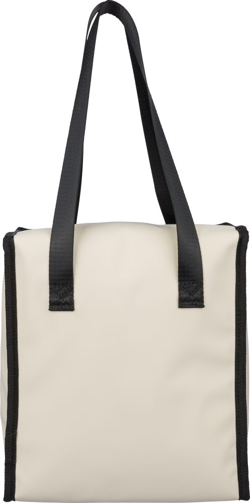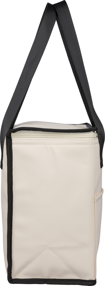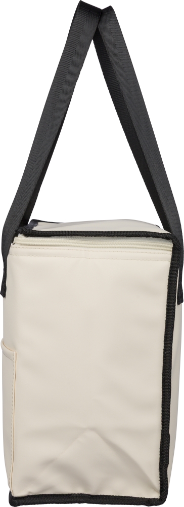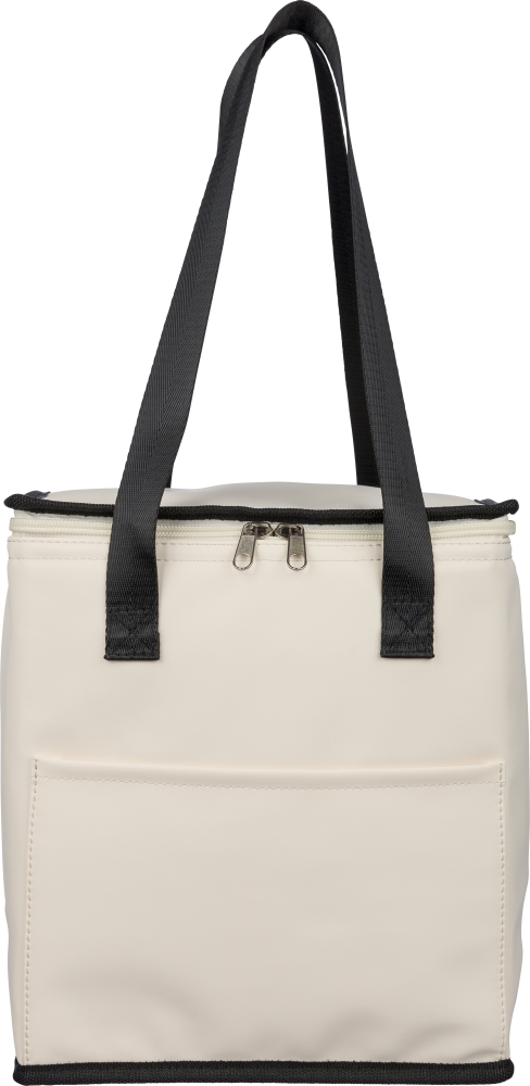 Recycled PU cooler bag (9 L capacity) with 210D recycled polyester lining. Features long carrying handles (2.5 × 66 cm) and a front pocket for additional storage. Includes a small recycled logo inside the label. Dimensions: 26 cm x 23 cm