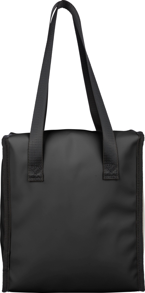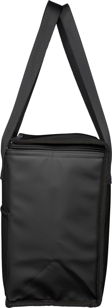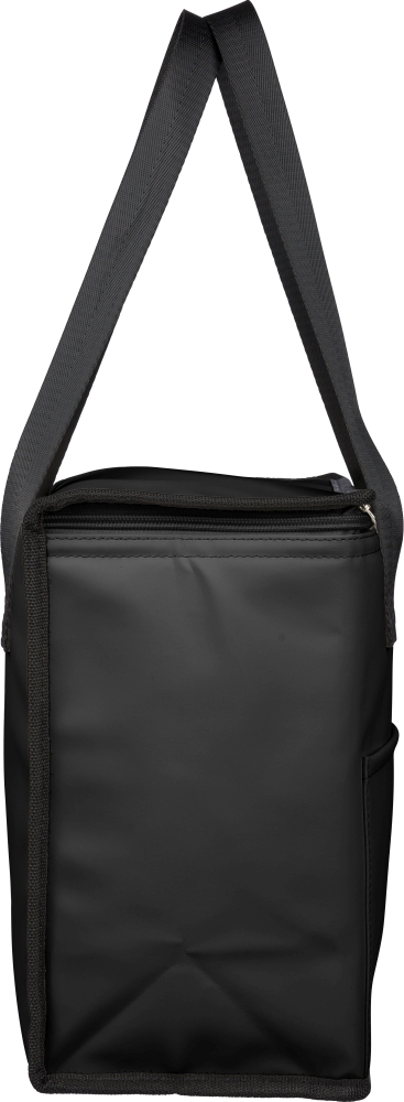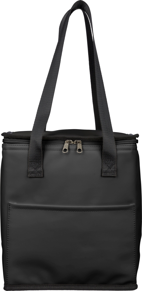 Recycled PU cooler bag (9 L capacity) with 210D recycled polyester lining. Features long carrying handles (2.5 × 66 cm) and a front pocket for additional storage. Includes a small recycled logo inside the label. Dimensions: 26 cm x 23 cm