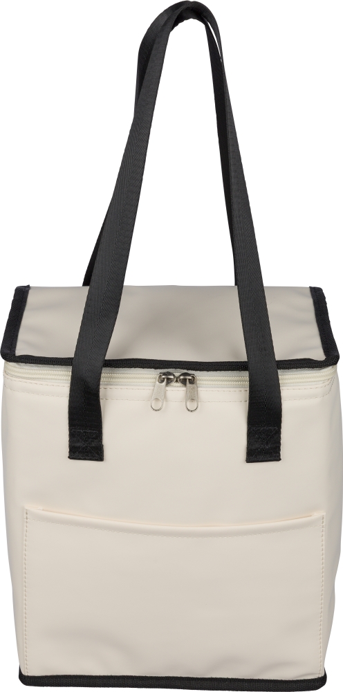 Recycled PU cooler bag (9 L capacity) with 210D recycled polyester lining. Features long carrying handles (2.5 × 66 cm) and a front pocket for additional storage. Includes a small recycled logo inside the label. Dimensions: 26 cm x 23 cm