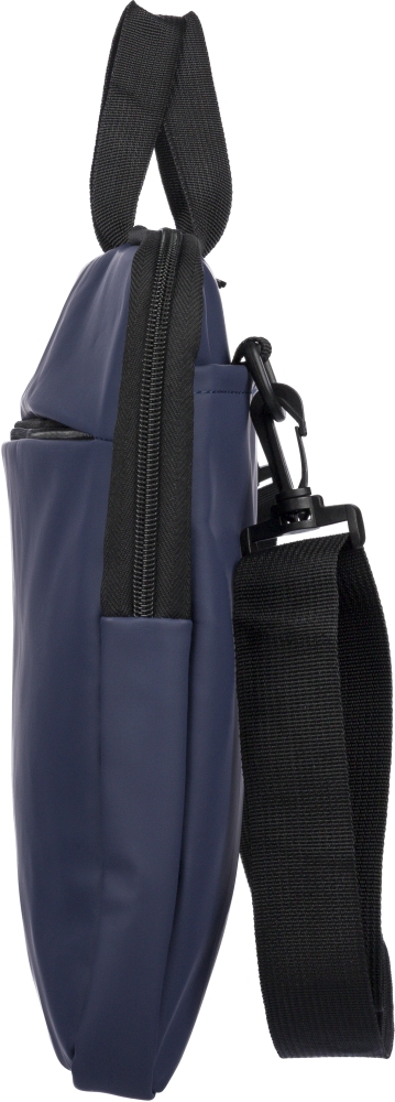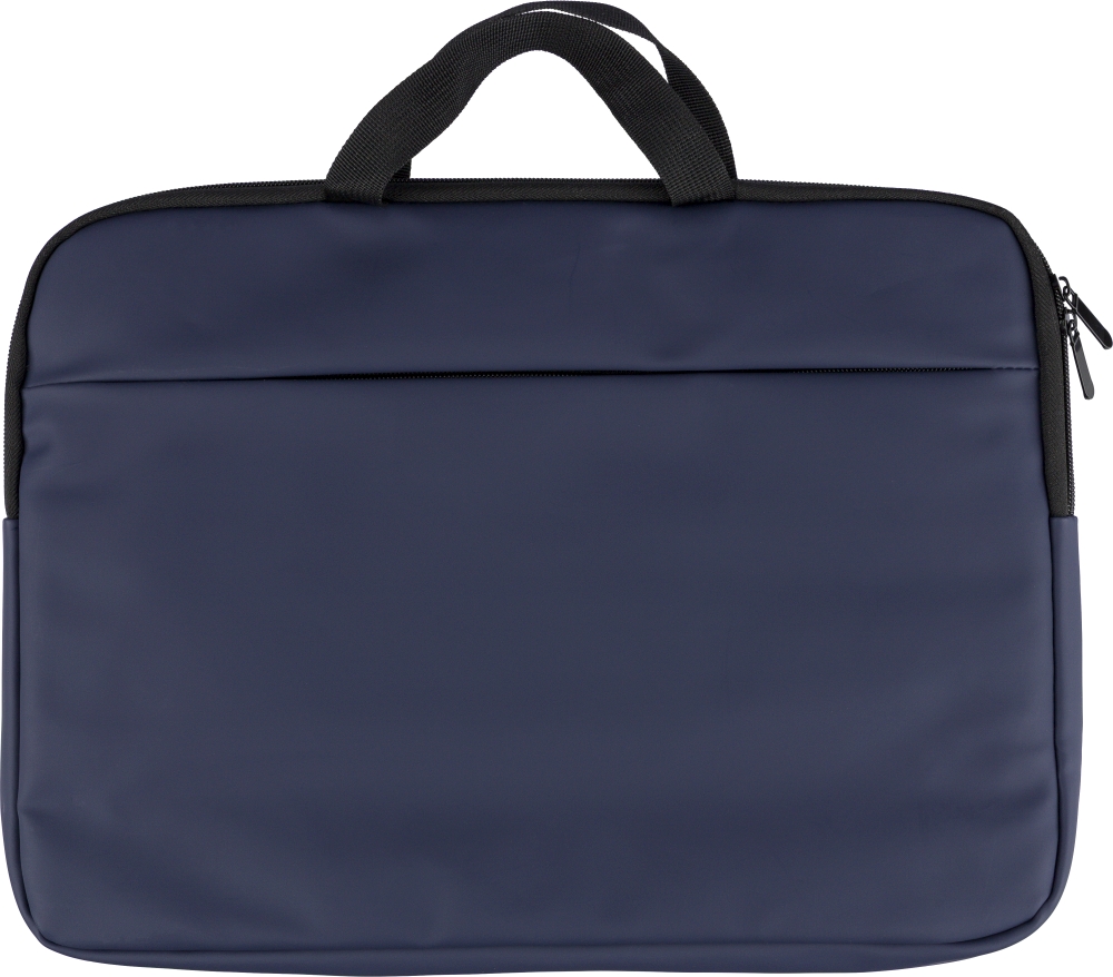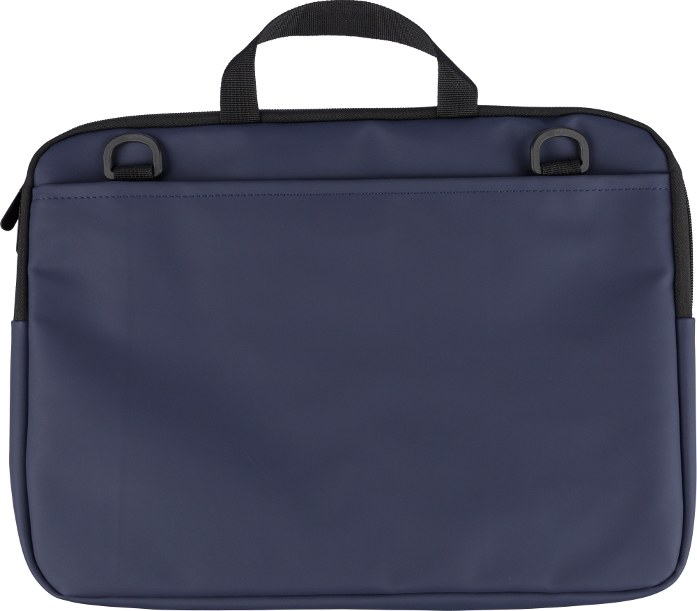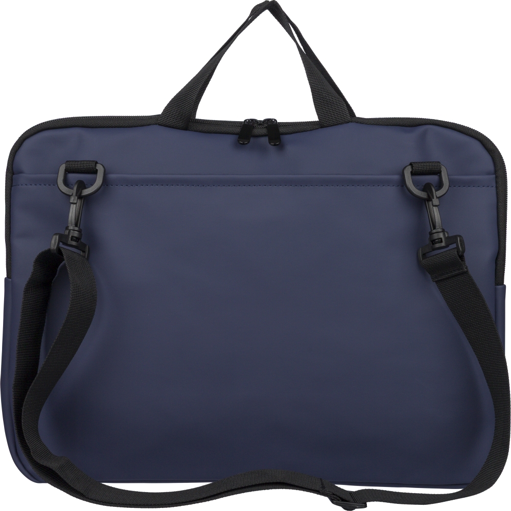 Recycled PU laptop bag for devices up to 15”, with 4 mm padding and 210D recycled lining. Features front zip pocket, back pocket with velcro, two short handles, adjustable shoulder strap, and small recycled logo in the inside label. Dimensions: 28 cm x 40 cm
