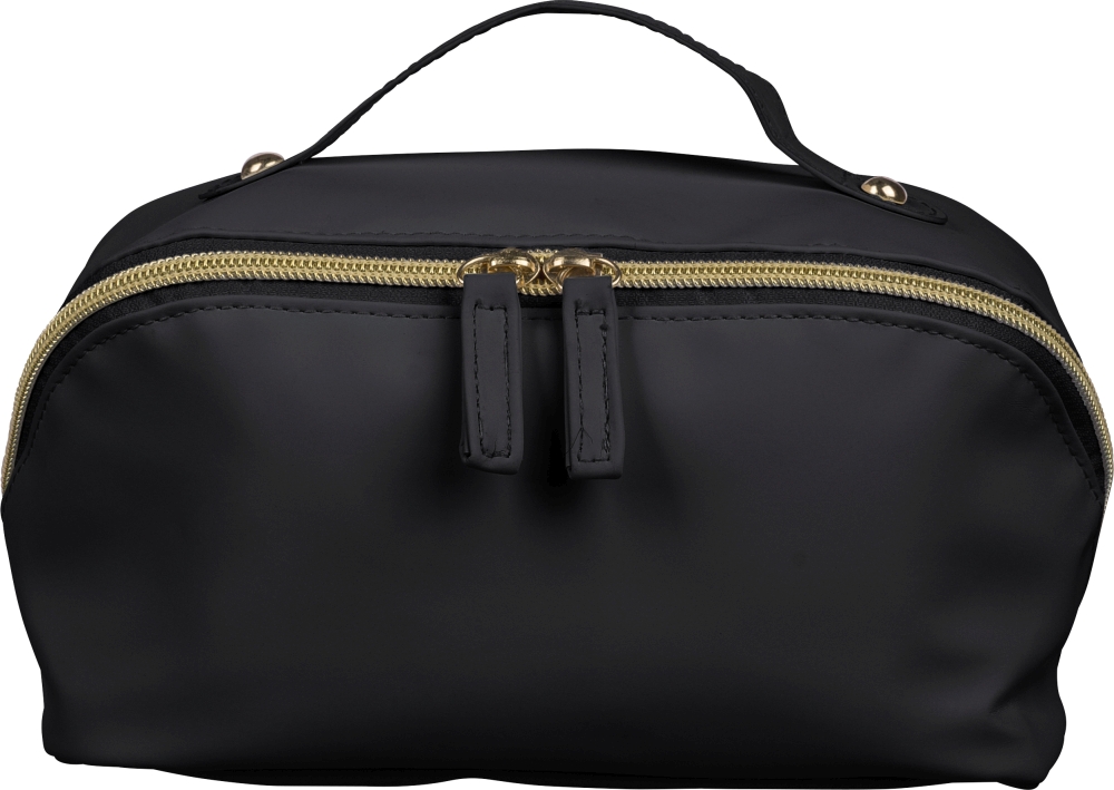 Recycled PU toilet bag with central zipper for wide opening. Features short handle, spacious interior with four compartments, including one inner zip pocket. Finished with 210D recycled lining and single recycled label inside. Dimensions: 12 cm x 22 cm