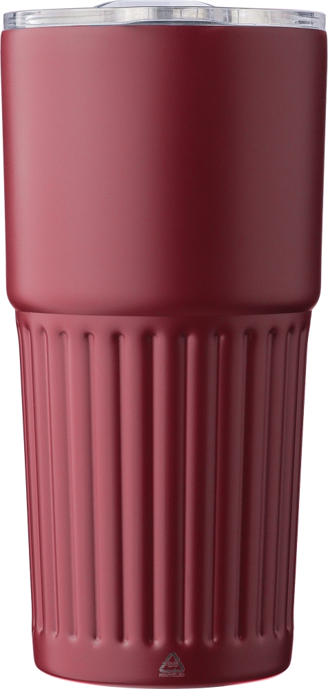 Recycled stainless steel double-walled drinking mug (500 ml). The interior is made of stainless steel 304 and the exterior is stainless steel 201 with a ridge grip design. Features an AS lid with a slide closure. Includes an engraved recycled logo on the body. Individually packaged in a brown cardboard box. Dimensions: 8,7 cm x 18,2 cm