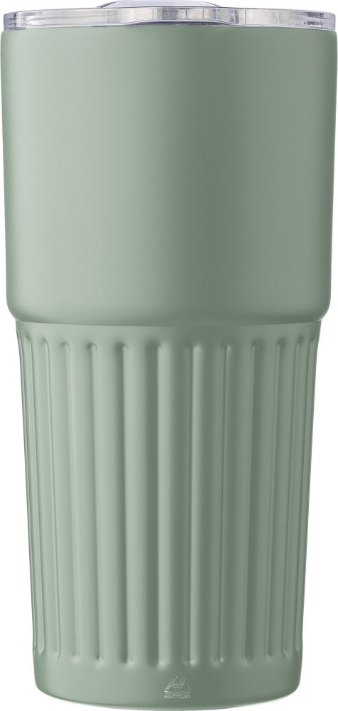 Recycled stainless steel double-walled drinking mug (500 ml). The interior is made of stainless steel 304 and the exterior is stainless steel 201 with a ridge grip design. Features an AS lid with a slide closure. Includes an engraved recycled logo on the body. Individually packaged in a brown cardboard box. Dimensions: 8,7 cm x 18,2 cm