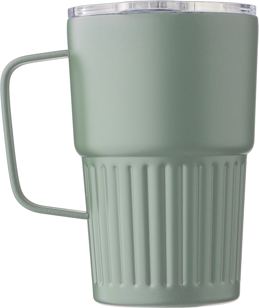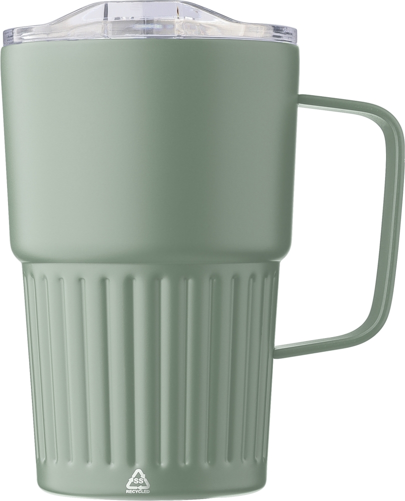 Recycled stainless steel double-walled drinking mug (450 ml). The interior is made of stainless steel 304 and the exterior is stainless steel 201 with a ridge grip and sturdy handle. Features an AS lid with a slide closure. Includes an engraved recycled logo on the body. Individually packaged in a brown cardboard box. Dimensions: 8,7 cm x 14 cm