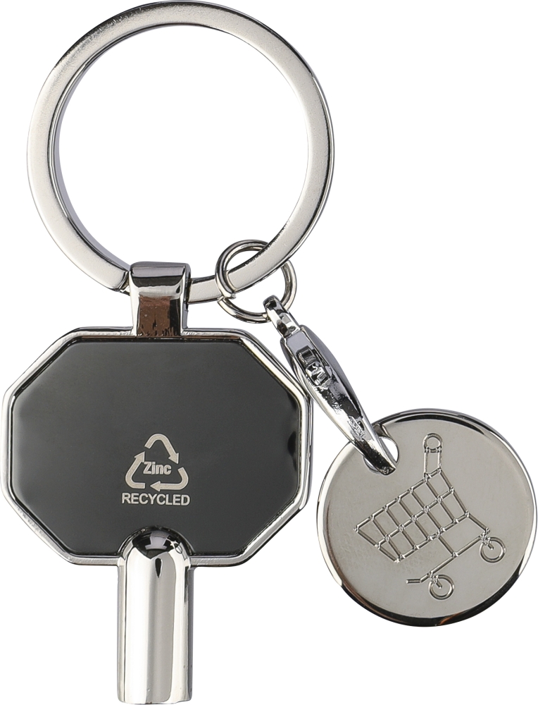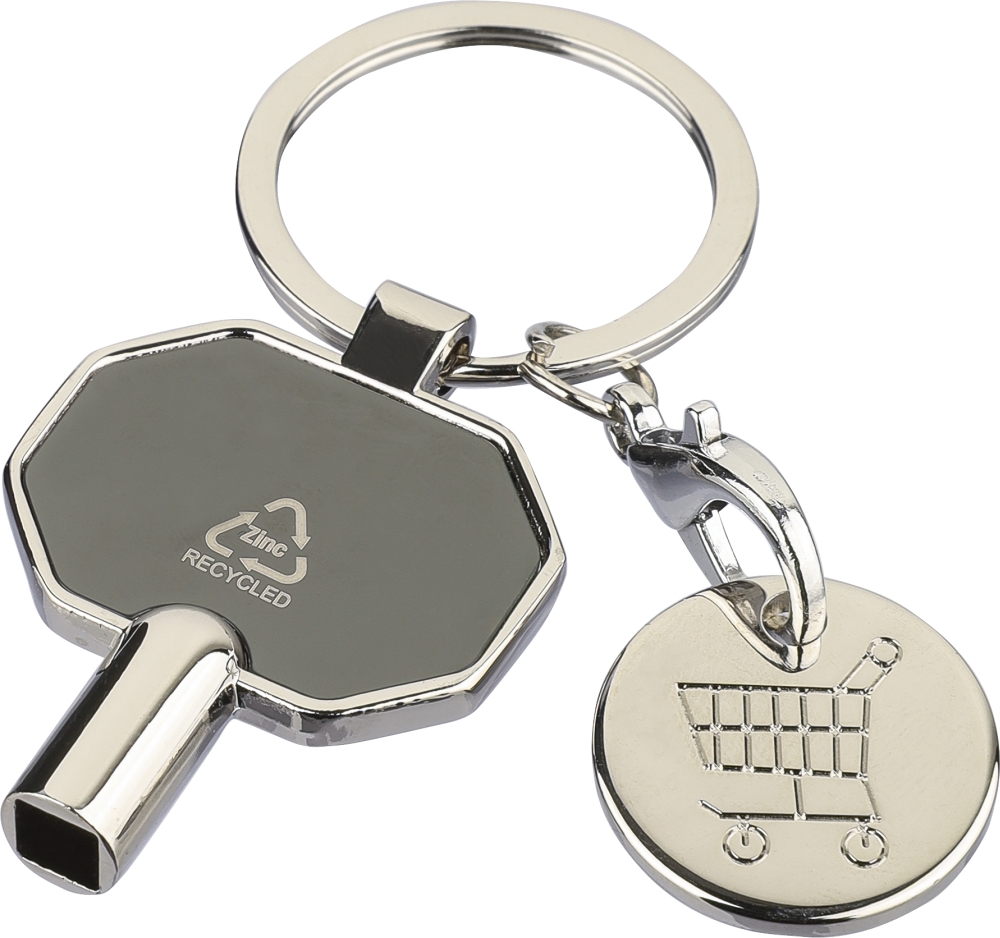 Recycled zinc alloy radiator bleed keychain with shopping coin. Includes 5×5 mm square key, standard in Europe for radiator bleeding. Comes with sturdy metal keyring and recycled logo. Packed in a brown carton envelope with illustration. Dimensions: 0,9 x 7 cm