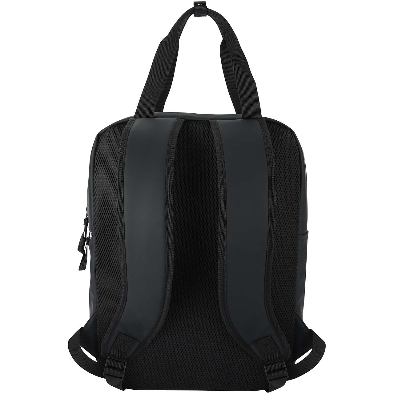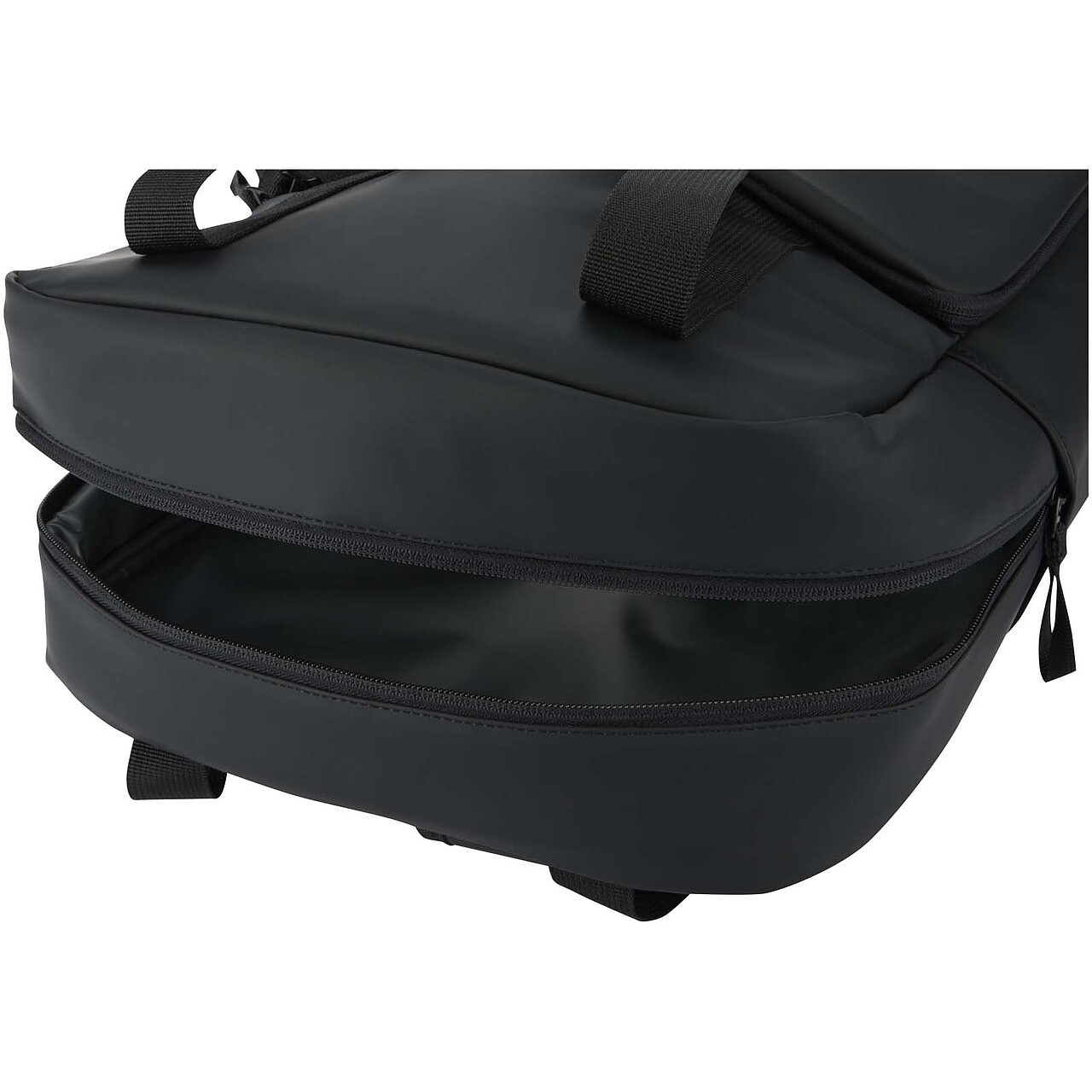 Made from GRS certified recycled PU leather with a matching RPET lining, this 18-litre backpack cooler backpack is designed for outdoor adventures. The spacious main compartment is insulated with high-quality PEVA lining and thick PE foam to keep food and drinks cool, while elastic webbing loops securely hold a bottle of wine. A large padded front zip pocket provides extra protection, and an open side pocket offers quick access to a drink bottle. For comfort, the bag includes breathable mesh on the back and adjustable and padded shoulder straps. Perfect for picnics, beach trips, and camping. Dimensions: 31 x 40 x 14 cm