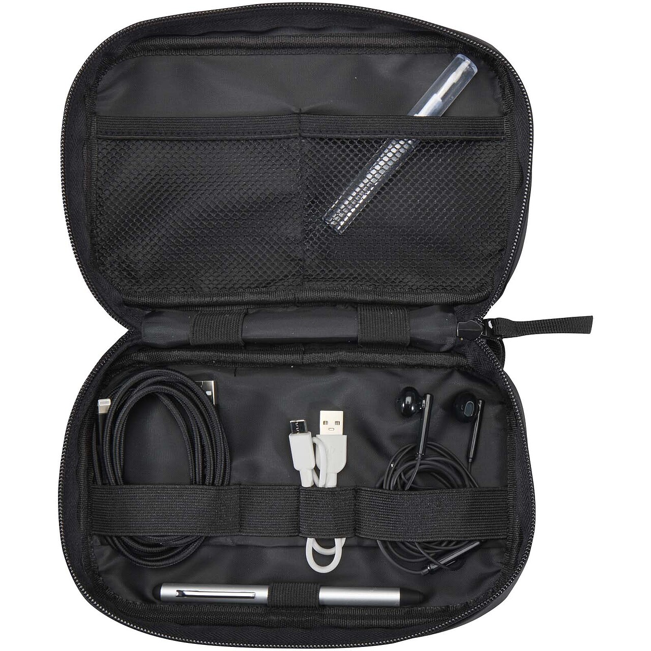 Made from GRS certified recycled PU leather with a matching RPET lining, this tech pouch is designed for travellers, remote workers, and tech enthusiasts. Compact and easy to carry in a backpack or cabin bag, it has a zipped main compartment with practical organisation features including an elastic pen loop, two mesh pockets for earbuds and small accessories, a reinforced divider, and multiple elastic loops to securely hold cables, USB drives, and chargers. The exterior includes a front pocket with hook-and-loop closure for quick access, along with a webbing handle for convenience. Finished with a water-resistant coating, it keeps your essentials protected wherever you go. Volume capacity: 1 litre. Dimensions: 21,5 x 13 x 5 cm