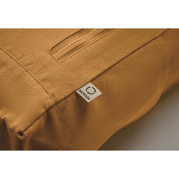 Roll top backpack with hook and loop closure in 390 gr/m2 recycled cotton (80%) and recycled polyester (20%). Zippered front pocket. Dimensions: 26 x 14 x 56 cm