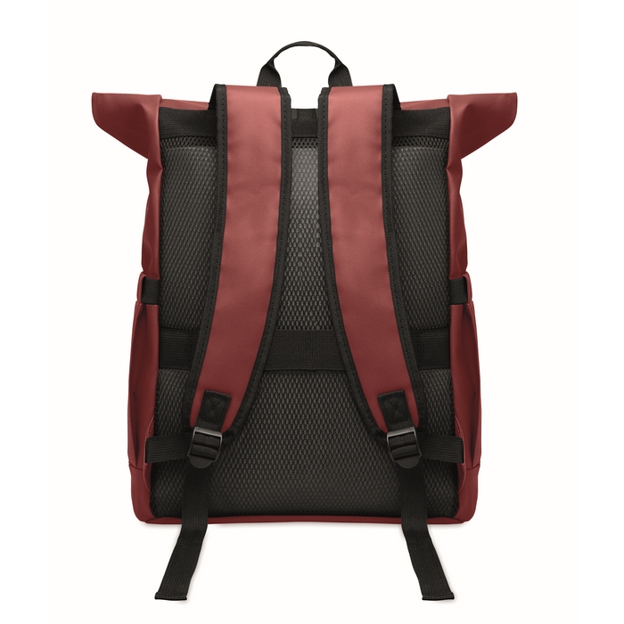 Roll top 15 inch laptop backpack in PU coated 600D RPET polyester and RPET polyester lining. Meshed padded back with zippered pocket and trolley strap. Padded shoulder strap with mesh inside finishing. Dimensions: 30 x 25 x 57 cm