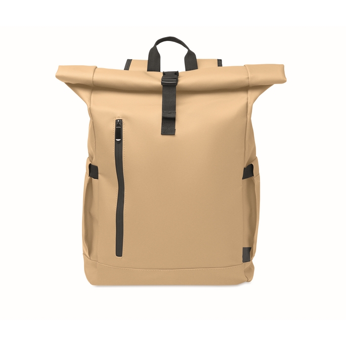 Roll top 15 inch laptop backpack in PU coated 600D RPET polyester and RPET polyester lining. Meshed padded back with zippered pocket and trolley strap. Padded shoulder strap with mesh inside finishing. Dimensions: 30 x 25 x 57 cm