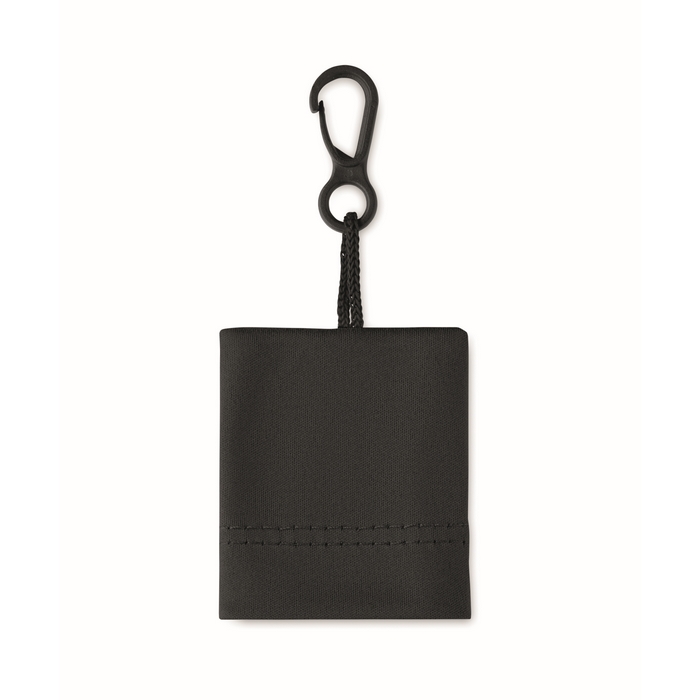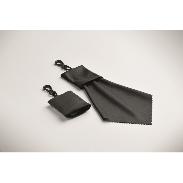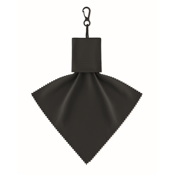 RPET cleaning cloth with self material pouch with PP plastic hanging hook. Dimensions: 15 x 18 cm