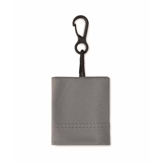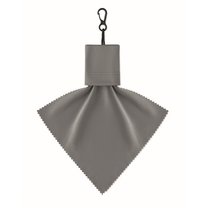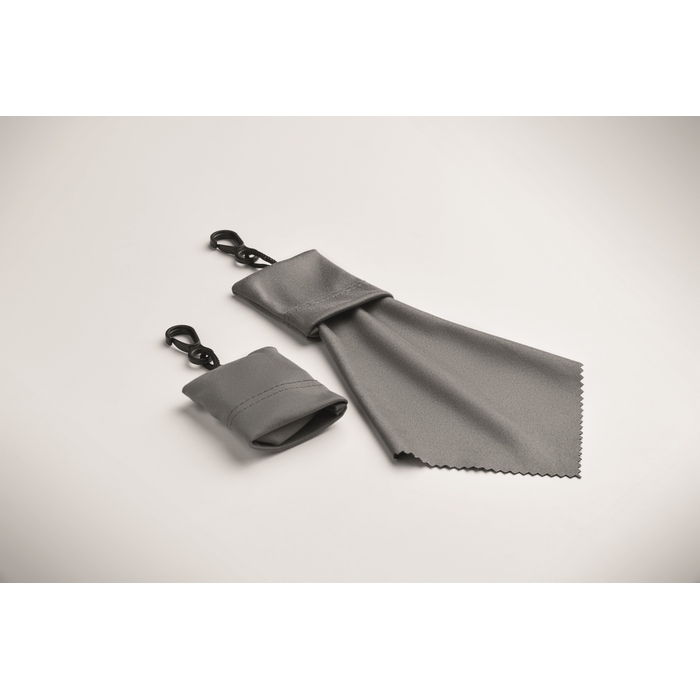 RPET cleaning cloth with self material pouch with PP plastic hanging hook. Dimensions: 15 x 18 cm