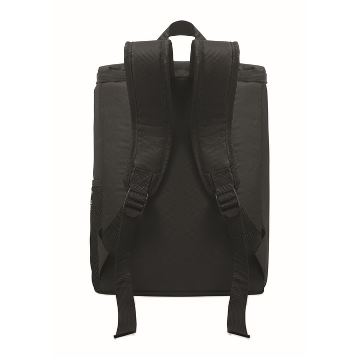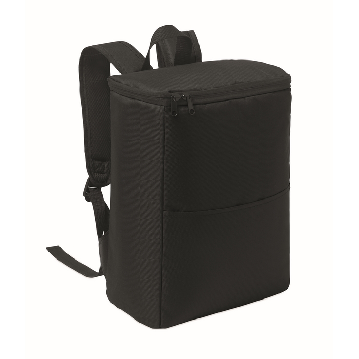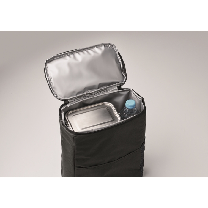 Cooler backpack in 600D RPET polyester with padded adjustable shoulder strap, 1 zippered side mesh pocket and 1 front pocket. PEVA lining with 13mm PE foam. Capacity 11L. Rozměry: 24.5 x 13.5 x 33.5 cm