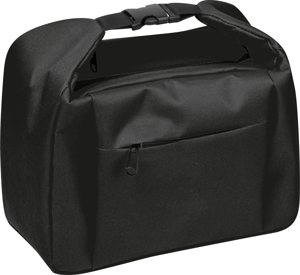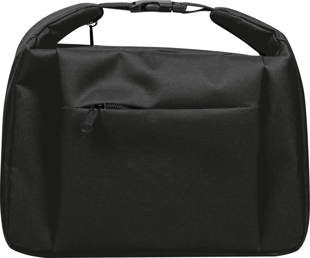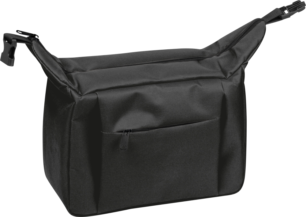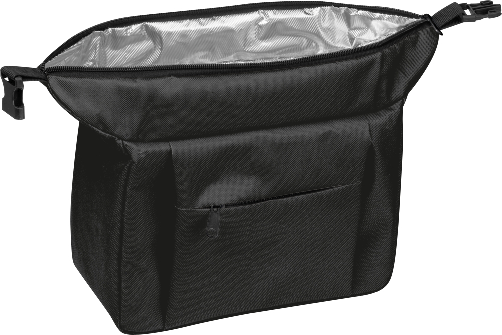 Cooler bag made from recycled polyester (RPET) with front zipper pocket, 5-liter capacity. Dimensions: 26,5 x 12,5 x 19 cm