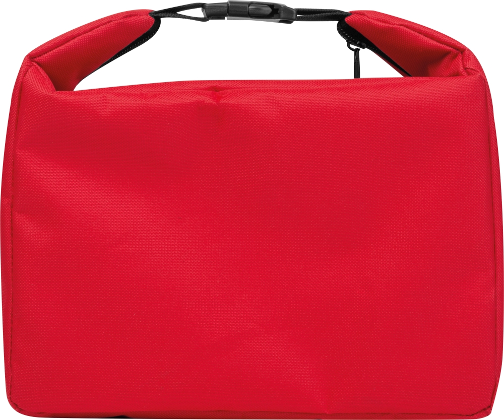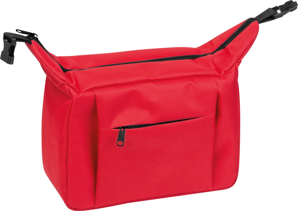 Cooler bag made from recycled polyester (RPET) with front zipper pocket, 5-liter capacity. Dimensions: 26,5 x 12,5 x 19 cm