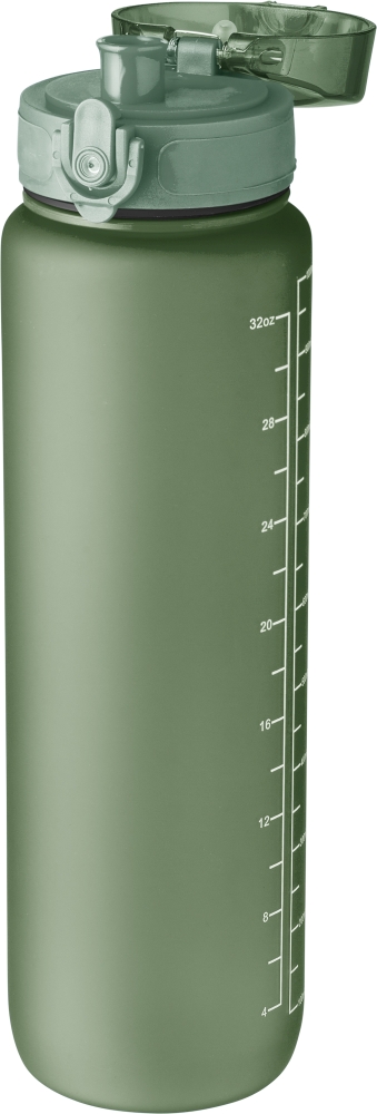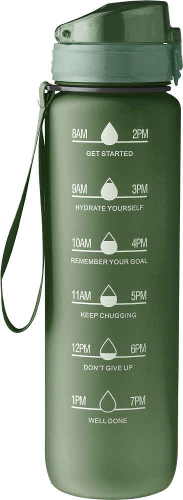 RPET drinking bottle (1000 ml) with matt finish and wristband. Leak proof. Dimensions: 7,5 x 28,5 cm