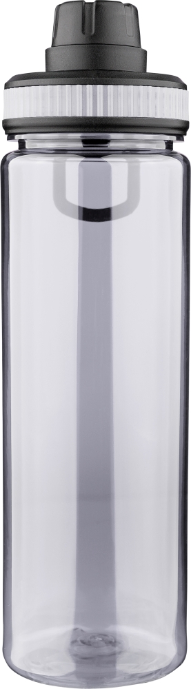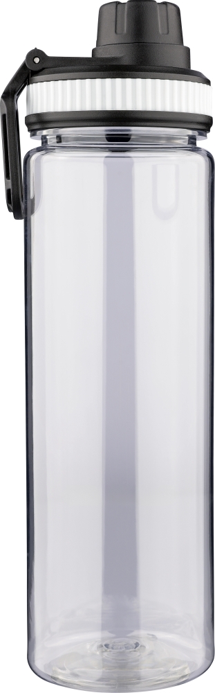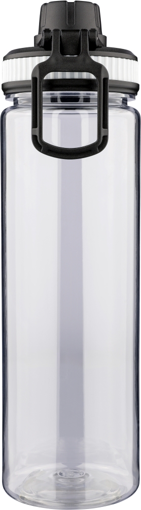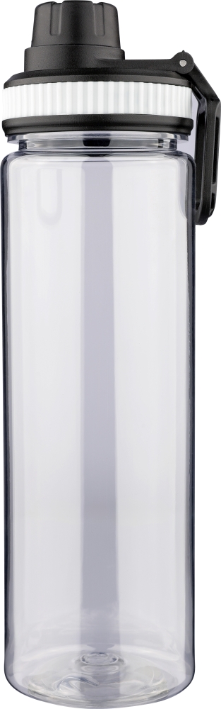 rPET drinking bottle (750 ml) with PP lid featuring a carrying handle and screw cap. Includes a colored silicone detail in the lid, matched to the transparent bottle body. Dimensions: 7 cm x 25 cm