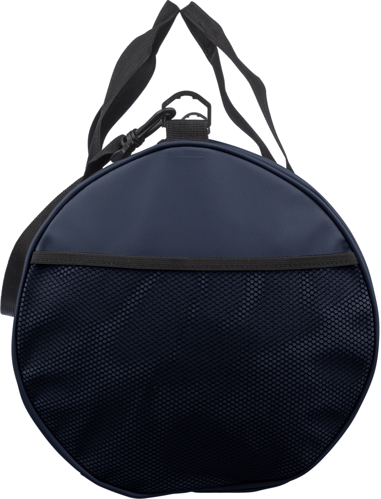 rPET duffle bag made from 600D polyester with 210D lining and water-repellent PU coating. Features a 40 l main compartment, front and side zippered pockets, mesh side pocket, two handles, and adjustable shoulder strap. Includes external rPET label. Dimensions: 28 cm x 51 cm