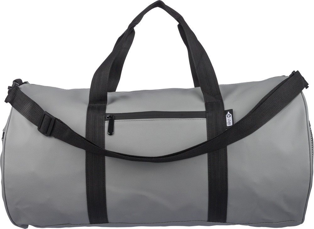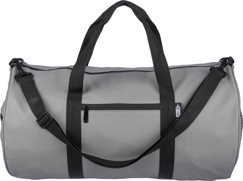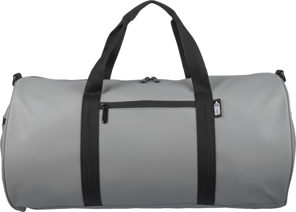 rPET duffle bag made from 600D polyester with 210D lining and water-repellent PU coating. Features a 40 l main compartment, front and side zippered pockets, mesh side pocket, two handles, and adjustable shoulder strap. Includes external rPET label. Dimensions: 28 cm x 51 cm