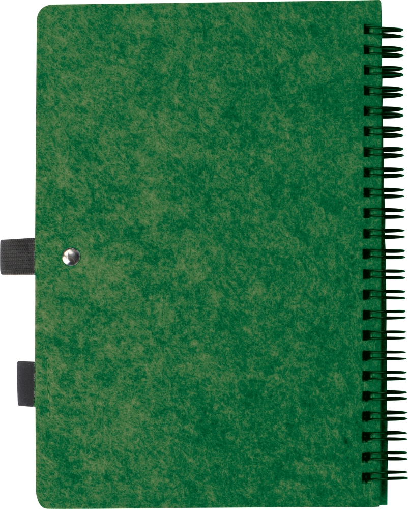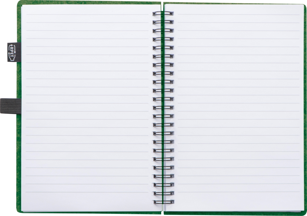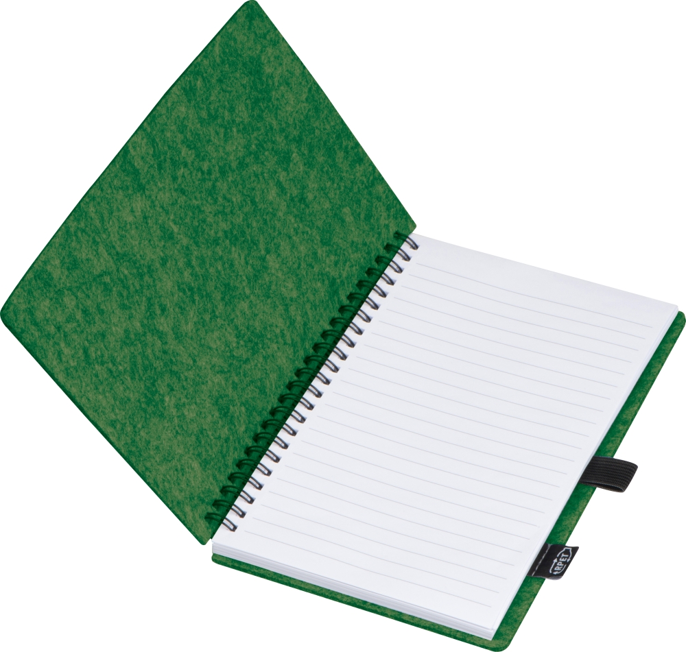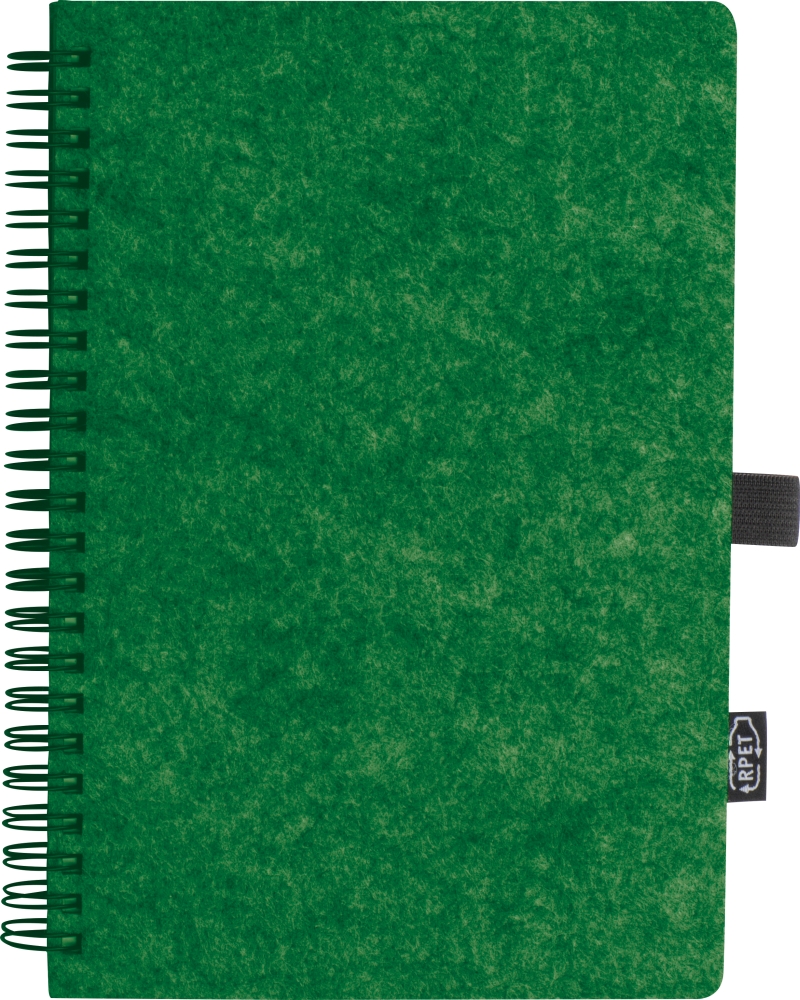 Notebook made of RPET felt and 160 lined pages of recycled paper with spiral binding and ballpen loop, with RPET label. Dimensions: 15,3 x 1,9 x 21,2 cm