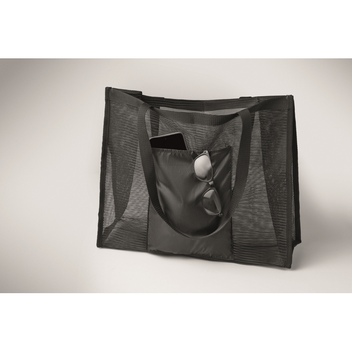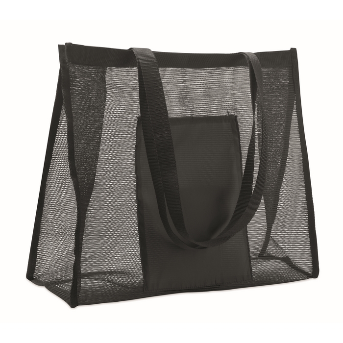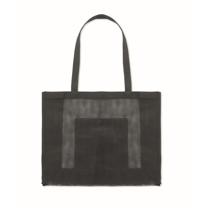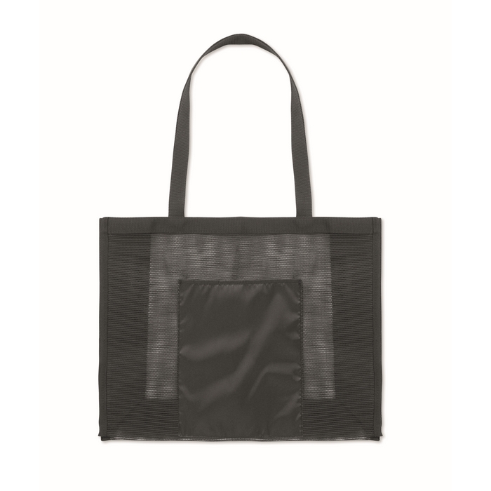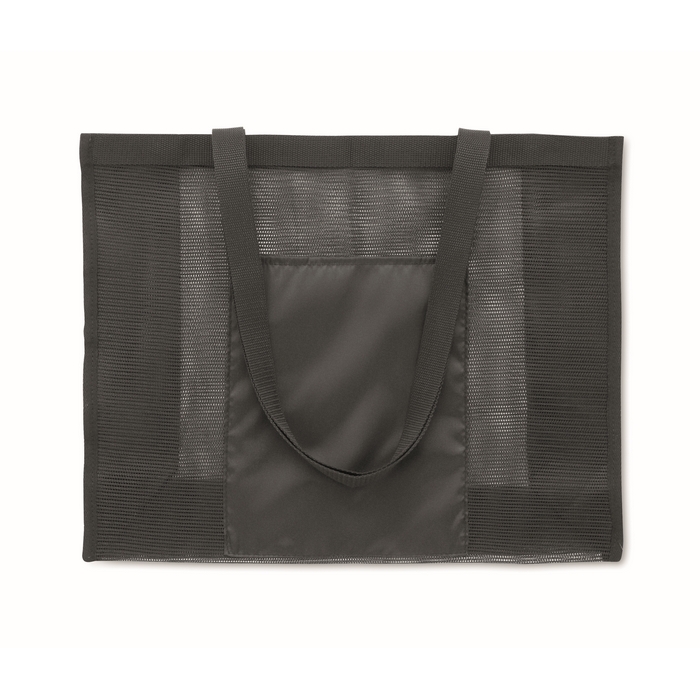 Shopping bag made of RPET mesh and 210D RPET with short handles. Includes large open front pocket. Capacity 20L, load up to 10 kg. Dimensions: 44.5 x 14 x 34 cm