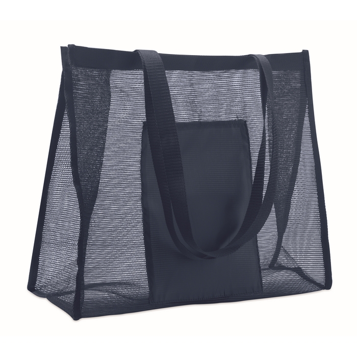 Shopping bag made of RPET mesh and 210D RPET with short handles. Includes large open front pocket. Capacity 20L, load up to 10 kg. Dimensions: 44.5 x 14 x 34 cm