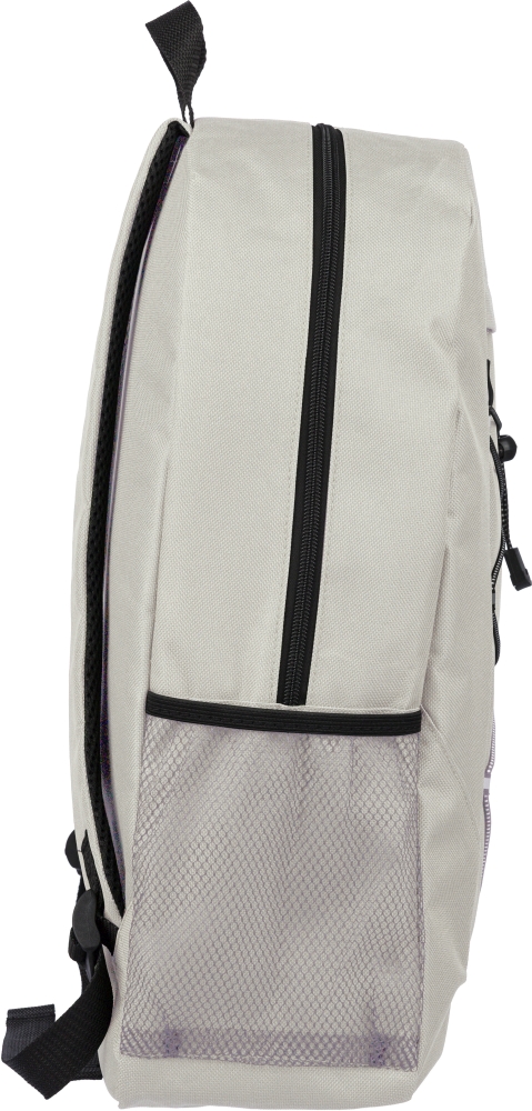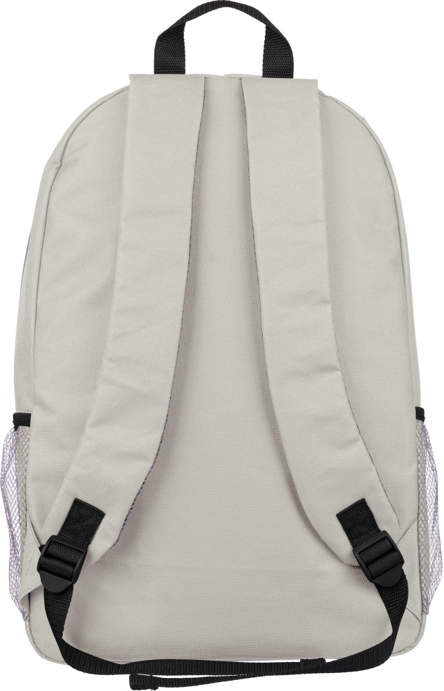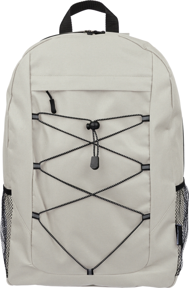 rPET polyester 600D adventure backpack with drawstring closure and large zippered main compartment. Features mesh side pockets, elastic front bands, small front zip pocket for decoration, adjustable straps, and rPET label. Dimensions: 14 cm x 30 cm