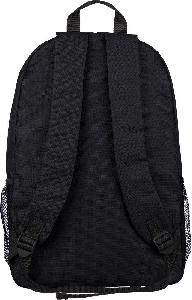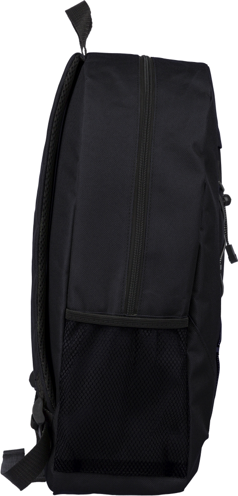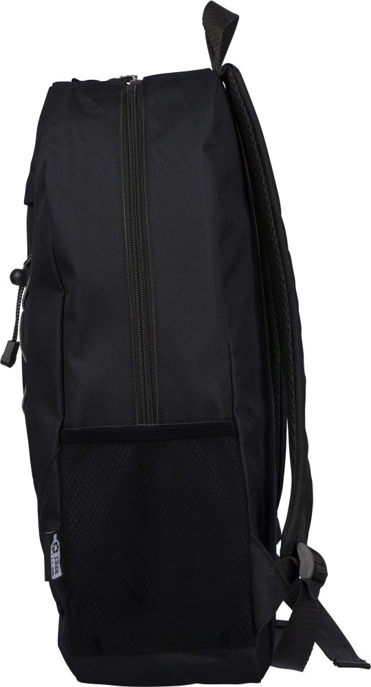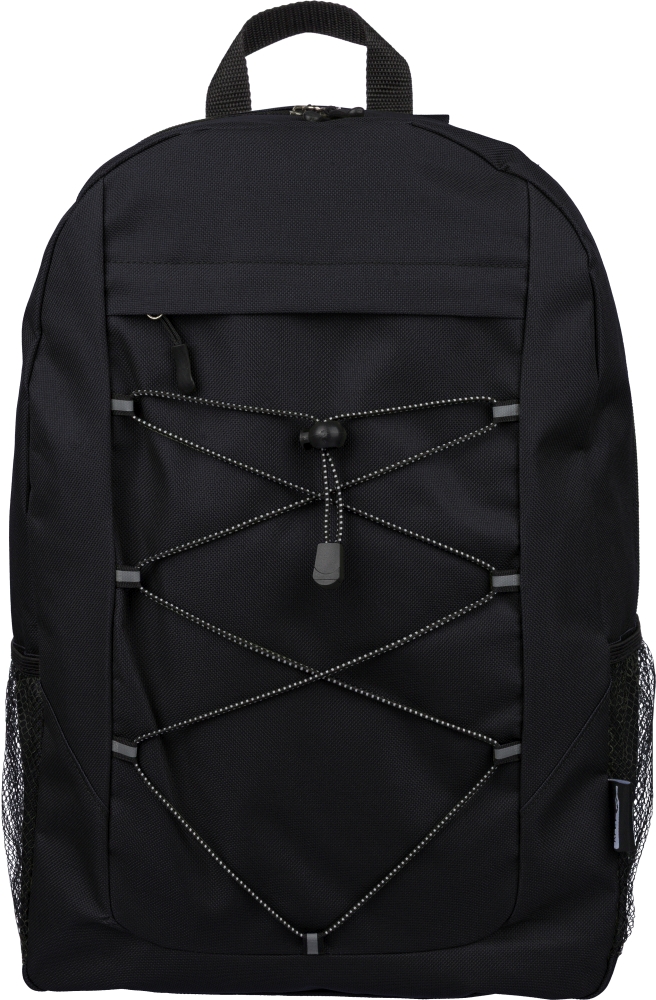rPET polyester 600D adventure backpack with drawstring closure and large zippered main compartment. Features mesh side pockets, elastic front bands, small front zip pocket for decoration, adjustable straps, and rPET label. Dimensions: 14 cm x 30 cm