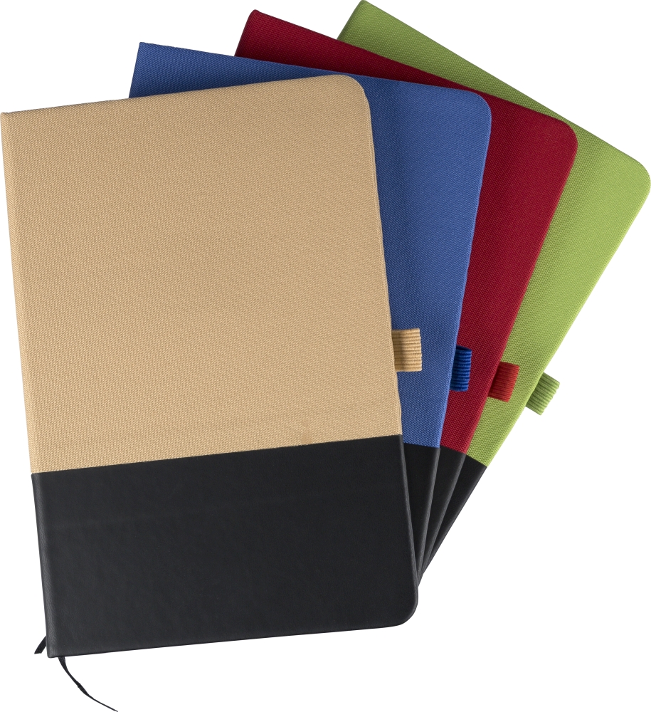 rPET polyester A5 notebook with partly laserable PU front. After engraving, the color matches the rPET fabric. Features 80 lined 70 gsm pages, elastic band, pen loop, and ribbon marker. Lower PU section is designed for engraving to reveal matching color. Dimensions: 1,5 cm x 21 cm