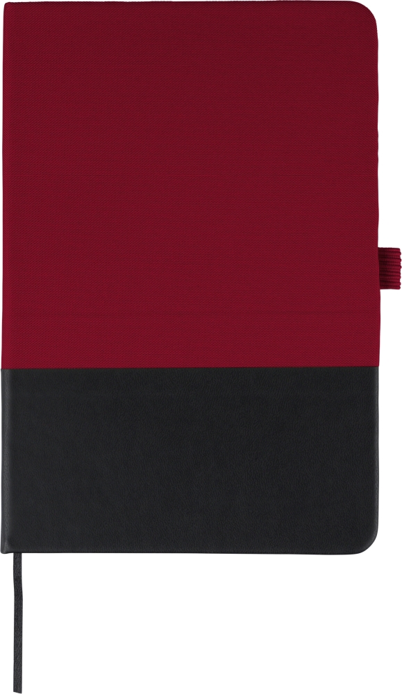rPET polyester A5 notebook with partly laserable PU front. After engraving, the color matches the rPET fabric. Features 80 lined 70 gsm pages, elastic band, pen loop, and ribbon marker. Lower PU section is designed for engraving to reveal matching color. Dimensions: 1,5 cm x 21 cm