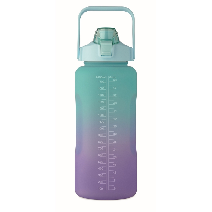 Motivational water bottle in RPET. Features a one-hand open flip-top lid with straw, safety lock, and handle. Leak-free. Capacity : 2000 ml Dimensions: O11 x 30 cm