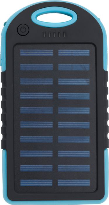 Rubberized ABS solar power bank with green indicator lights and a side flashlight. Two USB ports and one USB-C port. Solar charging 5V/200mA. Input DC 5V/1A. Output DC 5V/2x1A. Capacity: 4,000mAh. Includes USB cable. Dimensions: 14,4 x 7,5 x 1,5 cm