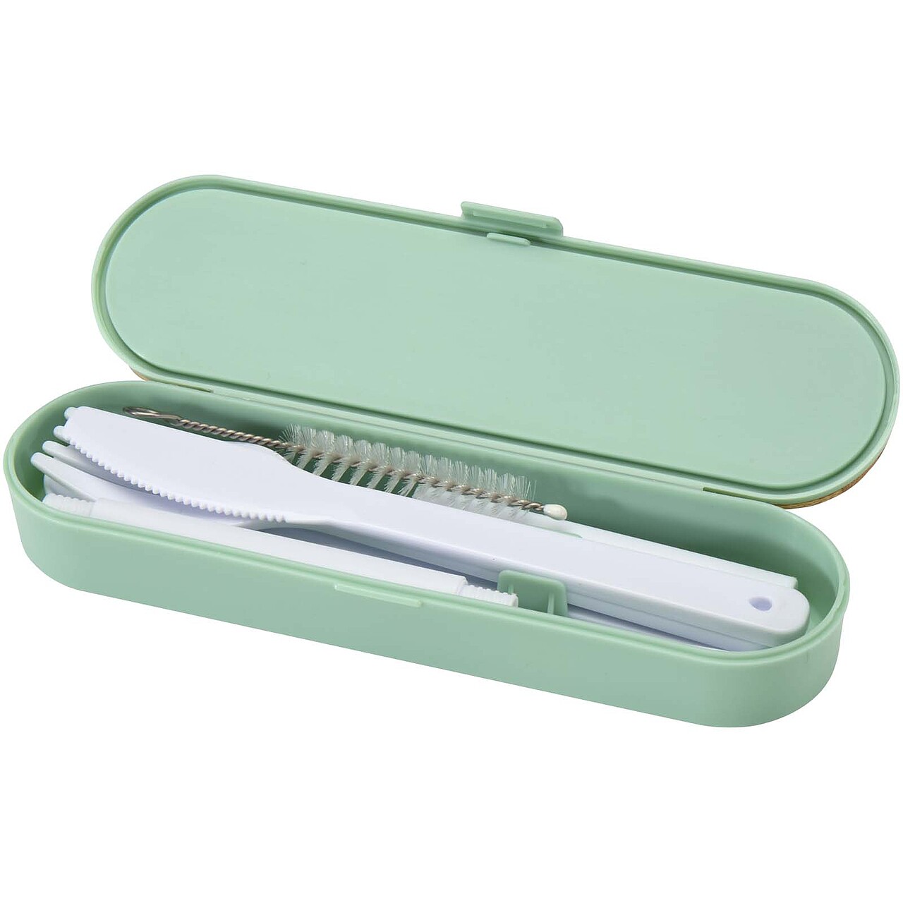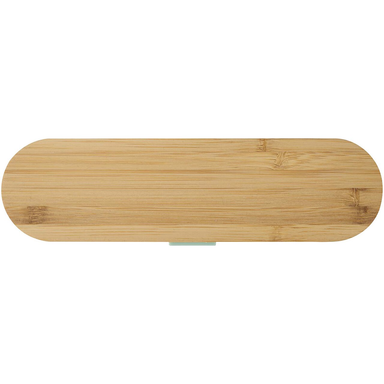 A reusable cutlery set with a bamboo lid, including a fork, knife, spoon, straw, and straw cleaner – ideal for meals on the go. Compact and easy to clean, it’s perfect for lunch boxes, travel, or office use. Dimensions: 16,5 x 2,6 x 4,7 cm