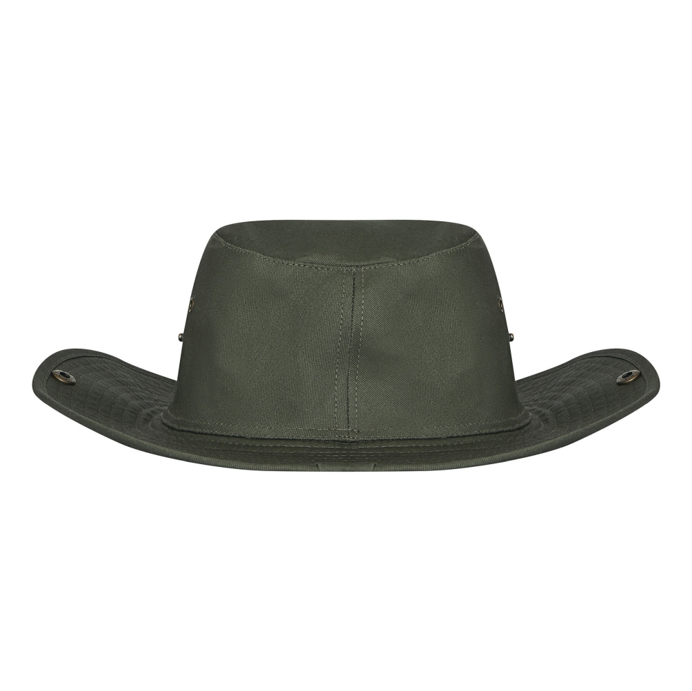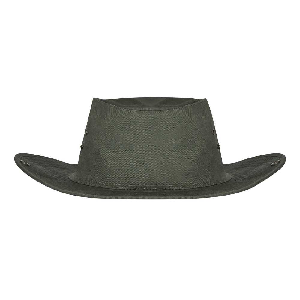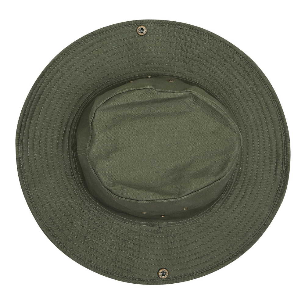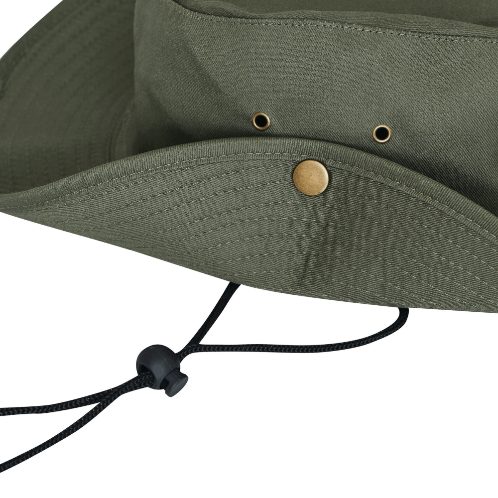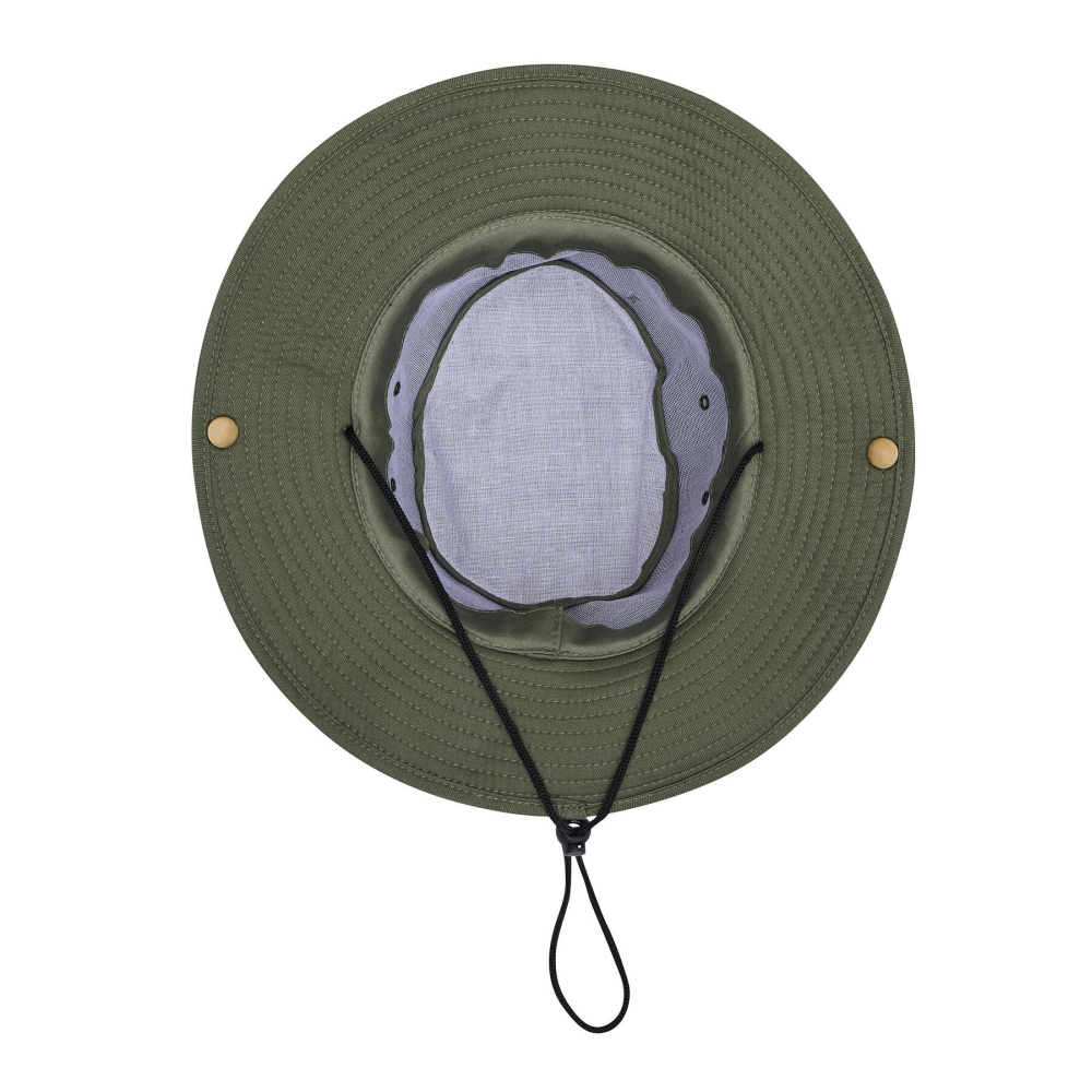 Safari hat: brim can be folded up laterally using snap buttons, 4 metal ventilation eyelets, chin strap with plastic stopper for size adjustment.