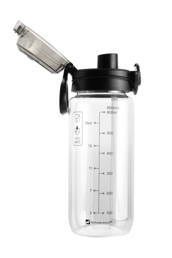 Schwarzwolf sports tritan bottle in a transparent color with a black lid and loop for hanging. The bottle has a volume of 650 ml and supports a healthy life style because it doesn´t contain BPA. It offers two drinking options: free flow or