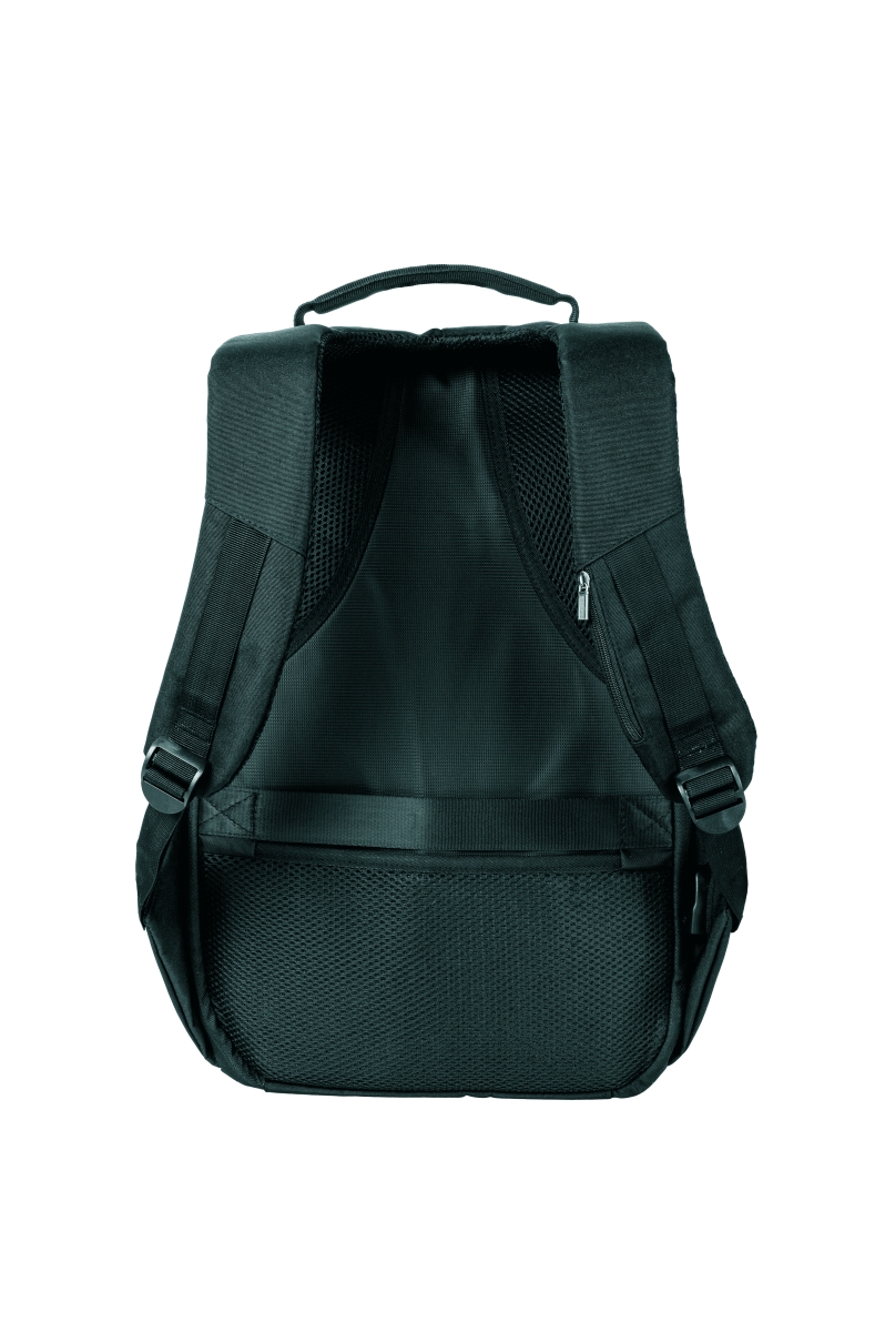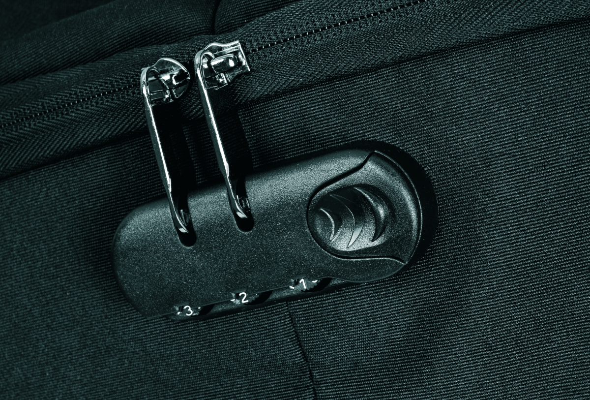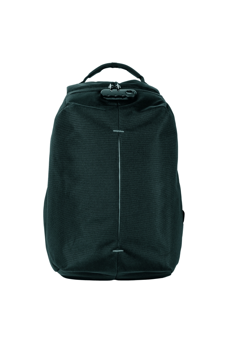 Safety backpack with anti-theft features. The entrance to the main area of the backpack is facing your own bag which makes it diffcult for someone else to access. The backpack also has a lock for securing zippers and a hidden pocket for a payment card or keys. In the inner part there is a padded space for a 15 „laptop and a 10“ tablet. And USB output with USB cable is also included. At the back is a belt for attachment to a suitcase. The front surface is equipped with a refective accessory. The volume of the backpack is 20,5 l. Material: 210D polyester. Recommended printing technology: silkscreen printing S2. Maximum print size: 100 × 80 mm. Size: 30 × 15 × 46 cm. Carbon footprint: gCO2 e13848.