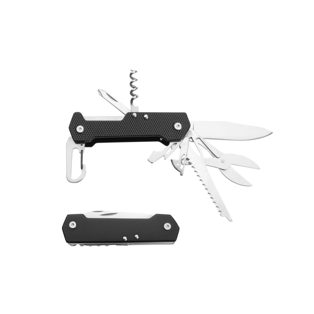 Multifunctional Schwarzwolf pocket knife. Includes 9 tools – knife, scissors, saw, corkscrew, bottle opener, can opener, flat screwdriver, phillips screwdriver and carabiner. The handle of knife is in a modern grooved design on the one side and has a smooth surface for your logo printing from the other side. Packed in a gift box. Material: tools – 2Cr13 stainless steel, handle – anodized aluminium. Dimensions: closed 9.7 × 2.7 × 1.9 cm. Carbon footprint: gCO2 e1727.