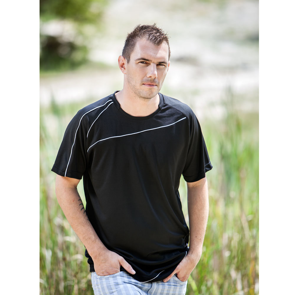 Functional Schwarzwolf men´s T-shirt with short raglan sleeves. It has fat seems, Schwarzwolf logo behind the neck and elegant contrast lines. It is made of comfortable quick drying material. T-shirt is suitable for sports and casual wear. Material: 100% polyester, 150–160 g/m2. Recommended printing technology: silkscreen printing S3. Carbon footprint: gCO2 e4013.