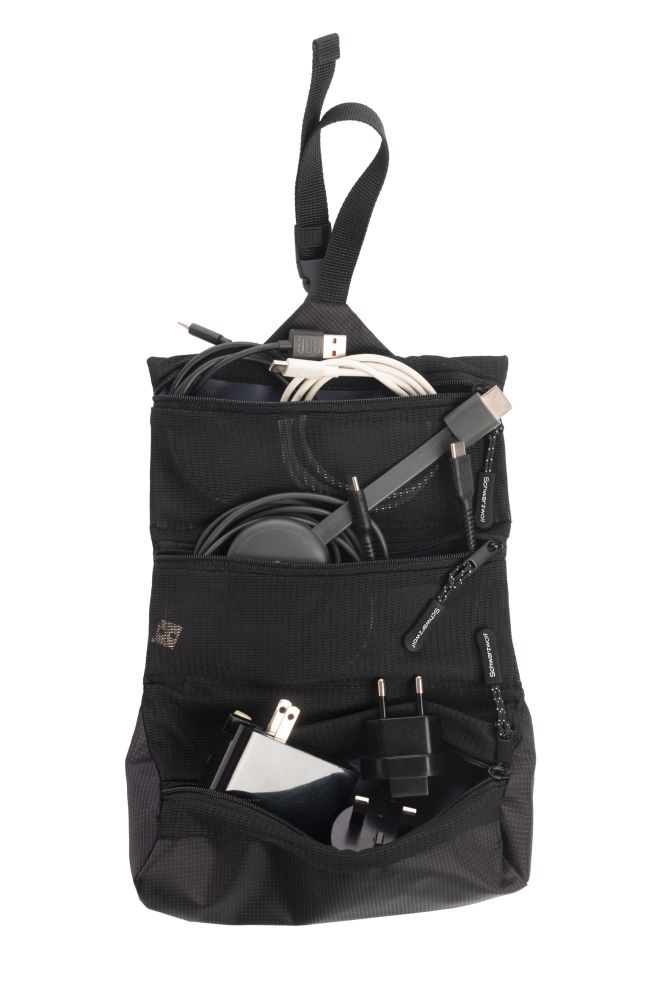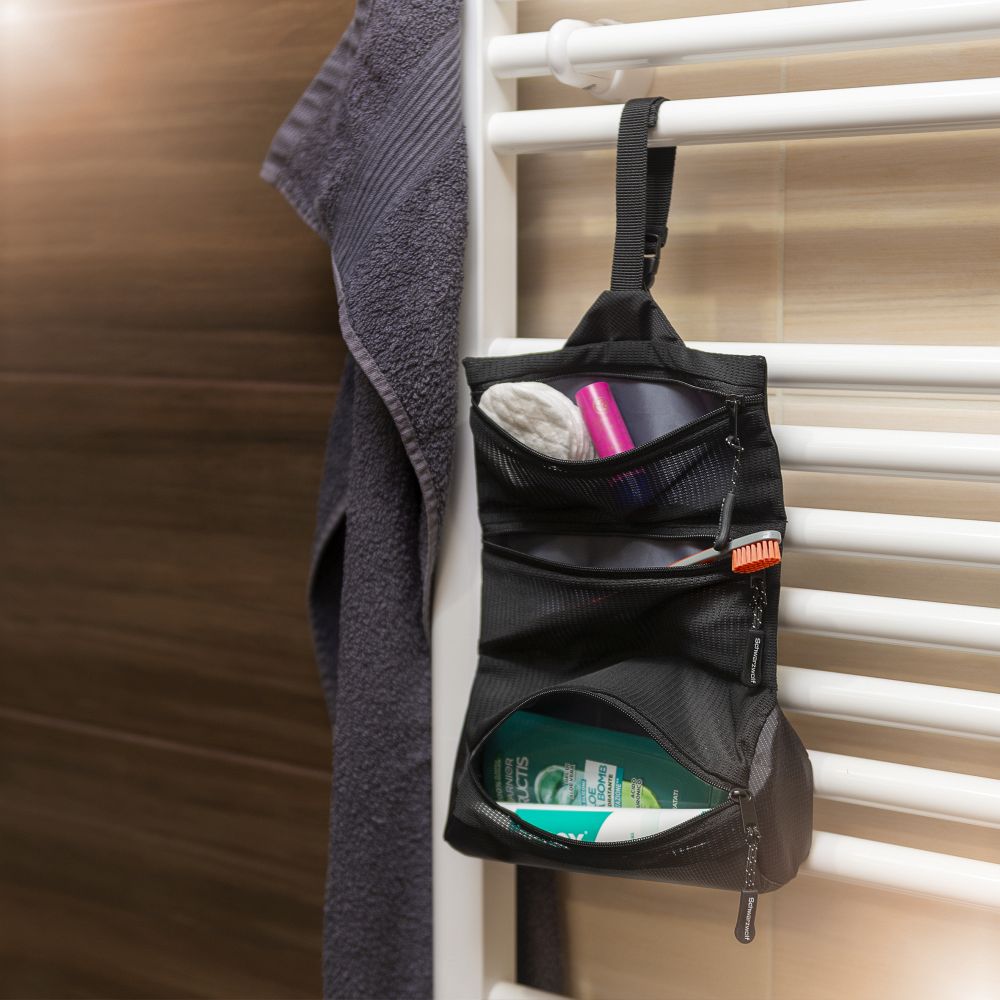 Practical multi-purpose Schwarzwolf bag for cosmetics and small items in black for comfortable travel. It can be used as an electronics organizer. The bag contains 3 mesh zippered pockets. It includes a buckle that can be used to close the rolled bag or to create a loop for hanging the bag.