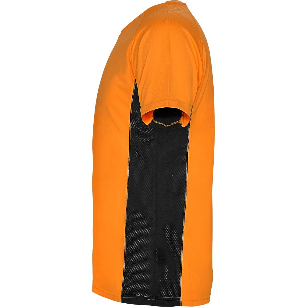Technical and breathable fabric. A combination of two polyester fabrics: Main fabric in birds eye, side panels and inner sleeve in microperforated fabric. Crew neck with inner reinforced covered seams. Removable label. Mesh with cool fit finish of 100% Polyester, 140 g/m2, Contrast fabric, Mesh with cool fit finish of 100% Polyester, 140 g/m2.