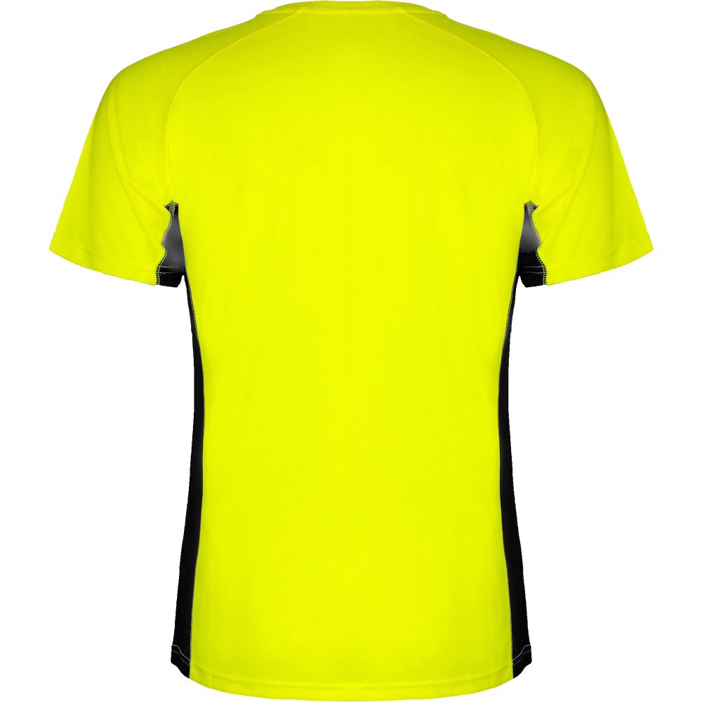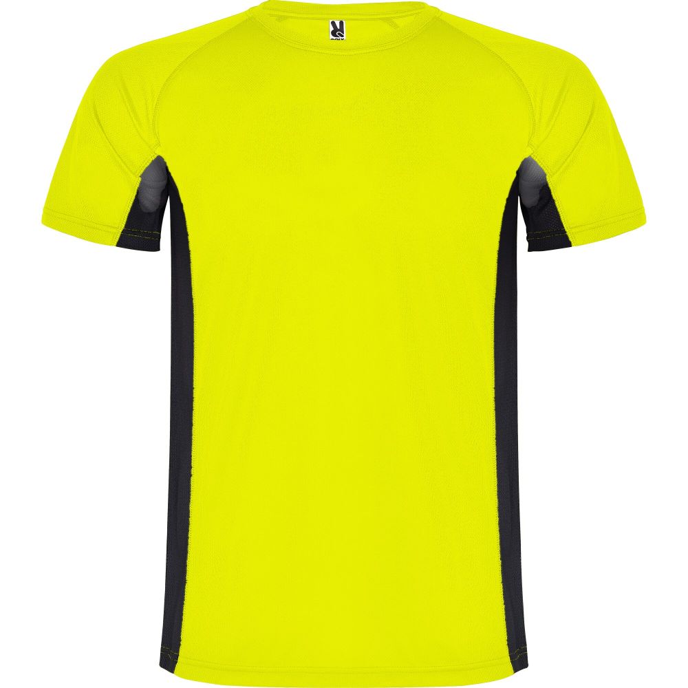 Technical and breathable fabric. A combination of two polyester fabrics: Main fabric in birds eye, side panels and inner sleeve in microperforated fabric. Crew neck with inner reinforced covered seams. Removable label. Mesh with cool fit finish of 100% Polyester, 140 g/m2, Contrast fabric, Mesh with cool fit finish of 100% Polyester, 140 g/m2.