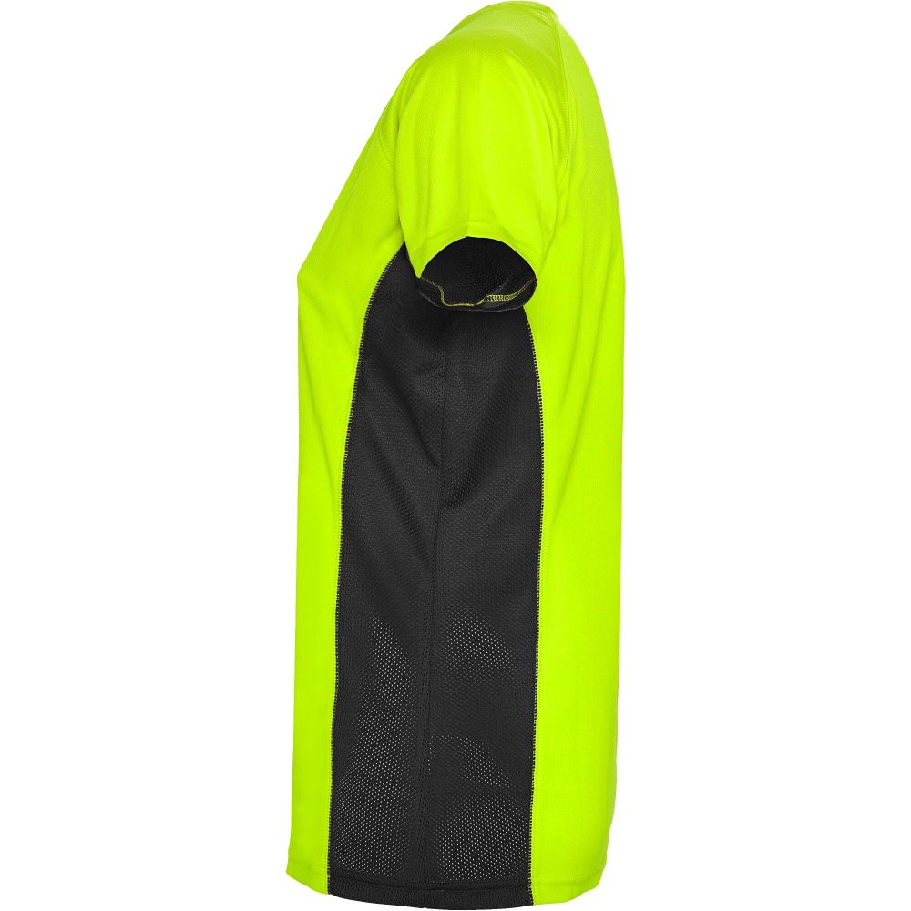 Technical and breathable fabric. A combination of two polyester fabrics: Main fabric in birds eye, side panels and inner sleeve in microperforated fabric. Crew neck with inner reinforced covered seams. Removable label. Mesh with cool fit finish of 100% Polyester, 140 g/m2, Contrast fabric, Mesh with cool fit finish of 100% Polyester, 140 g/m2.