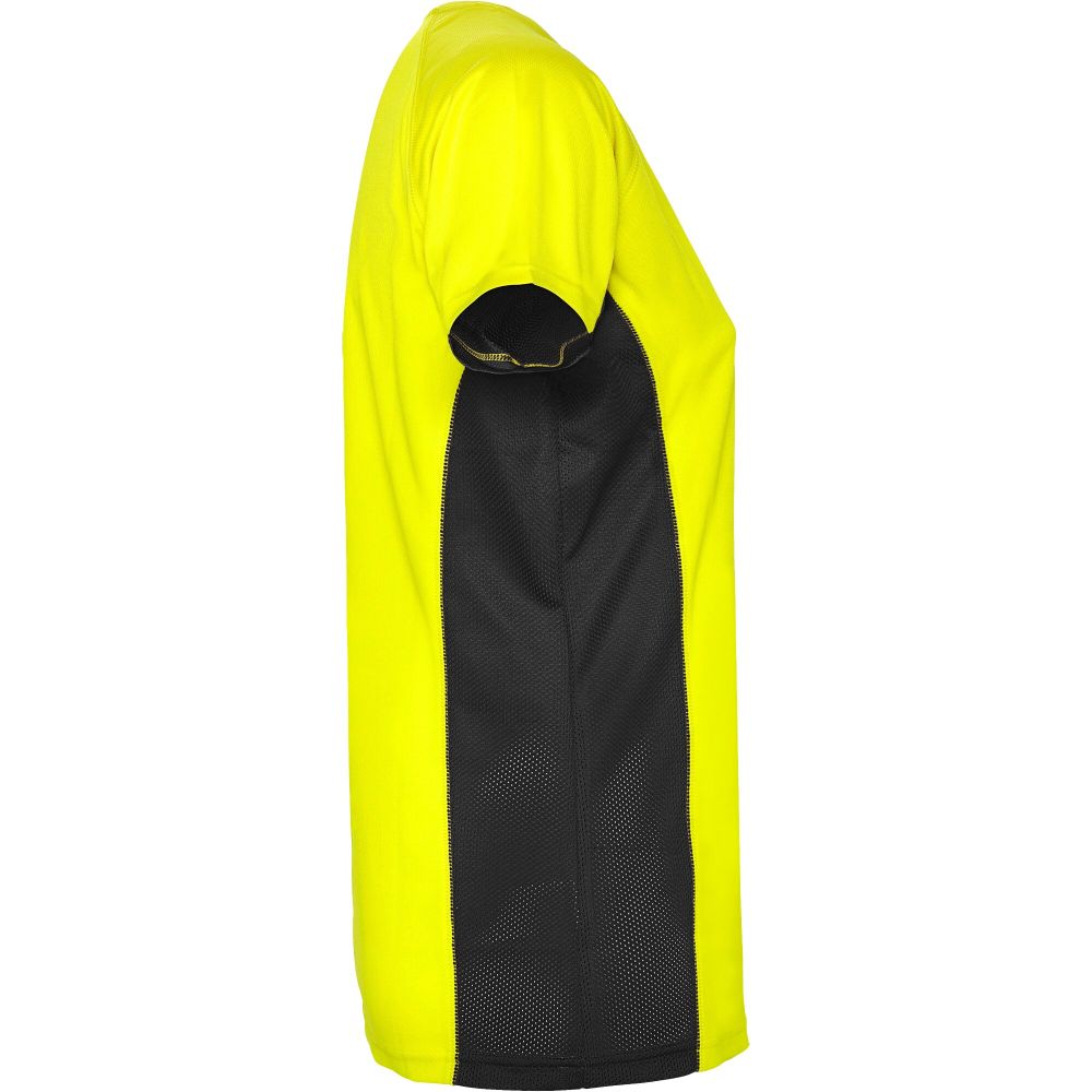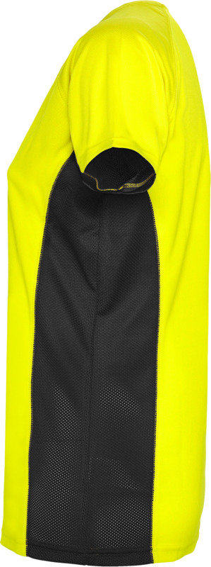 Technical and breathable fabric. A combination of two polyester fabrics: Main fabric in birds eye, side panels and inner sleeve in microperforated fabric. Crew neck with inner reinforced covered seams. Removable label. Mesh with cool fit finish of 100% Polyester, 140 g/m2, Contrast fabric, Mesh with cool fit finish of 100% Polyester, 140 g/m2.