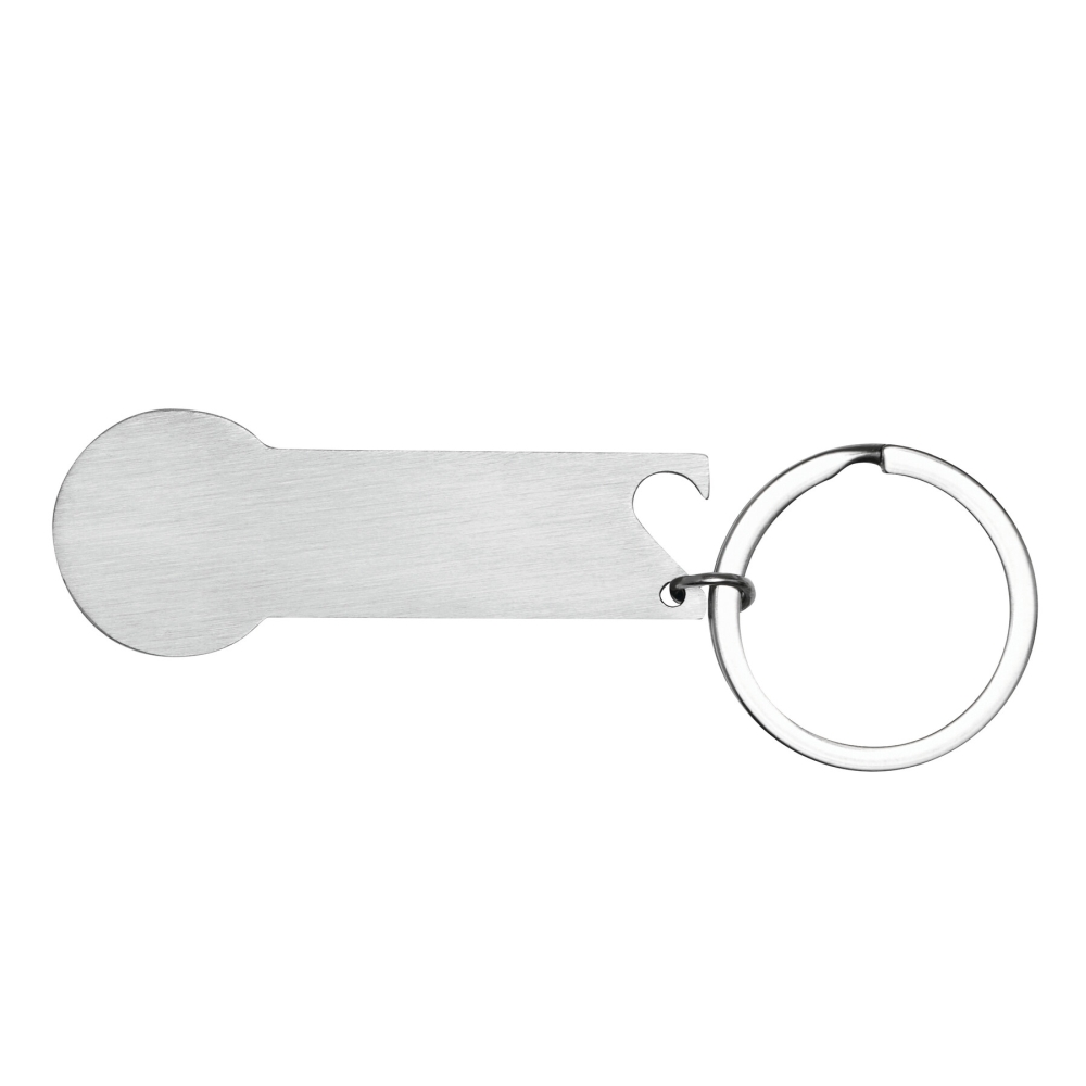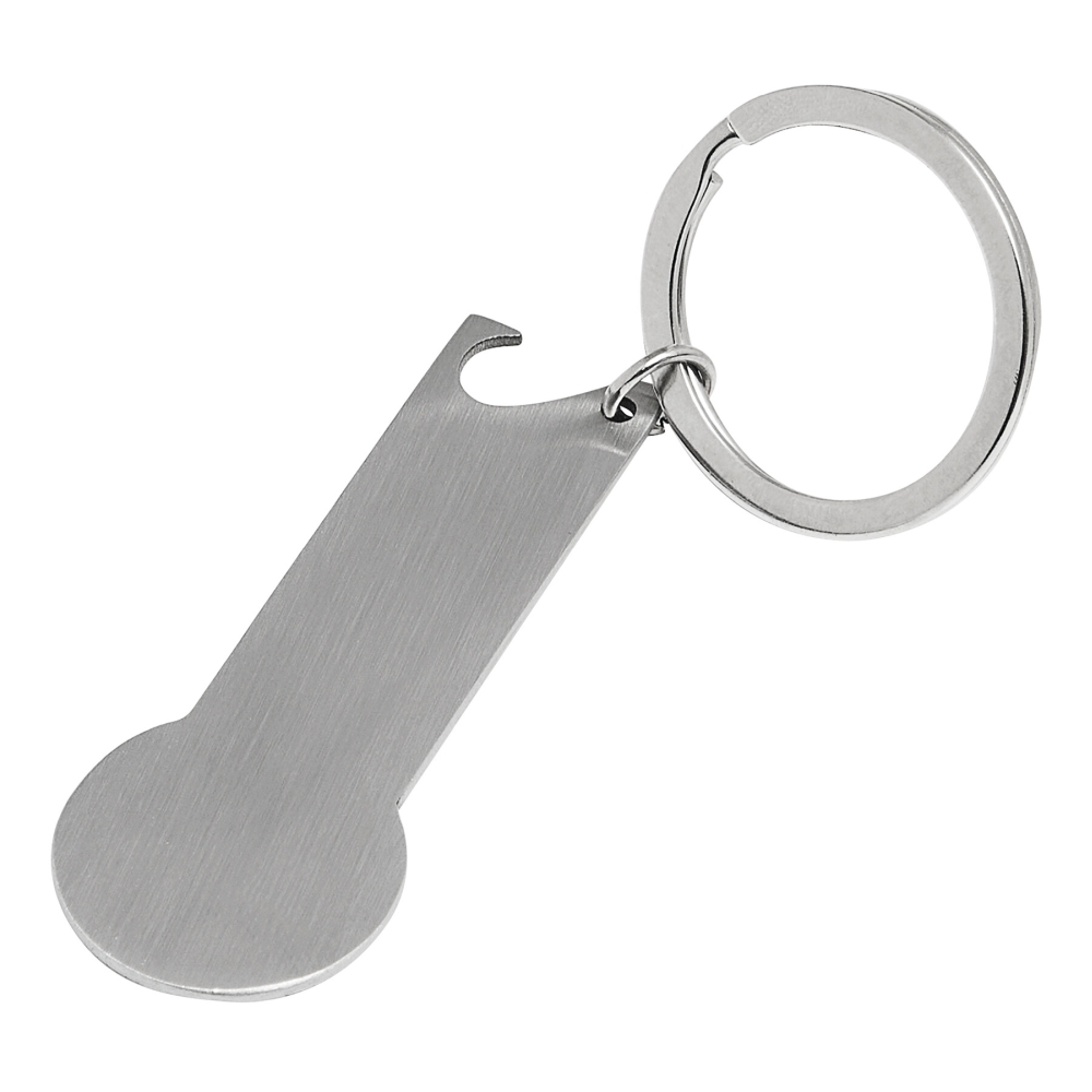 Shopping trolley releaser: matches the size of a 1 Euro coin, with integrated bottle opener and key ring. Dimensions: 6 x 2,3 x 0,1 cm